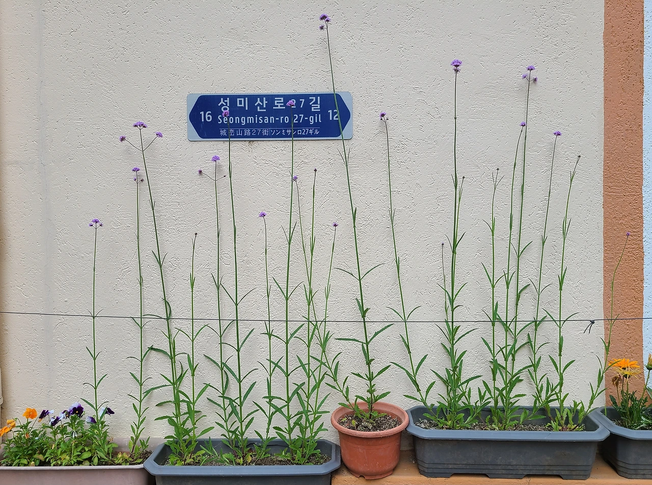 첫 번째, 키다리 아저씨를 닮은 식물은 버들 마편초. 잎이 버들잎처럼 좁고 길며, 줄기와 꽃대가 말채찍(마 편)처럼 생겨 붙여진 우리말 이름이라 한다. 숙근 버베나라고도 불리는데, 여러해살이 뿌리 식물이라는 뜻의 ‘숙근(宿根)’과, 학명 ‘버베나(Verbena)’가 결합된 유통명이라 한다.