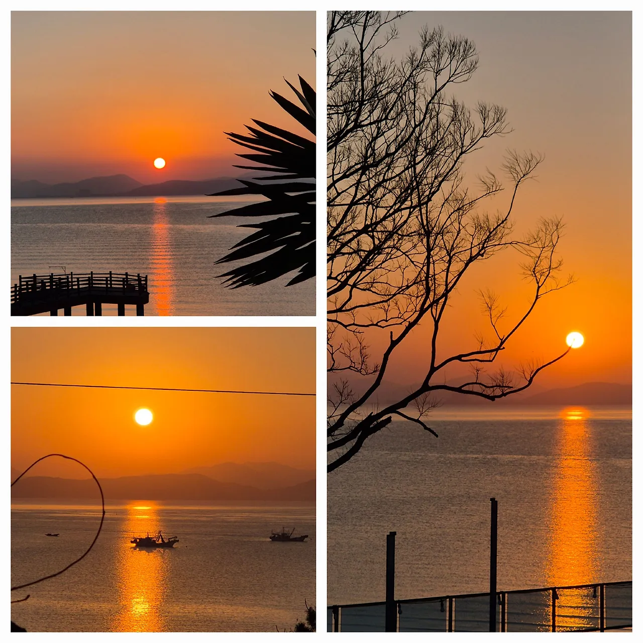 이미 수평선 위로 떠오른, 말간 주황빛 태양과 바다에 비친 해 그림자, 바다 위에 떠 있는 어선들과 길가에 있는 나무의 실루엣까지, 어떻게 이렇게 조화로운 아름다움을 연출할 수 있을까? 감탄에 감탄! 남편의 세련된 사진 기술 덕분에 그 장관을 거의 그대로 담을 수 있어 차를 세우고 기다리고 있던 우리 모두 행복해했다.