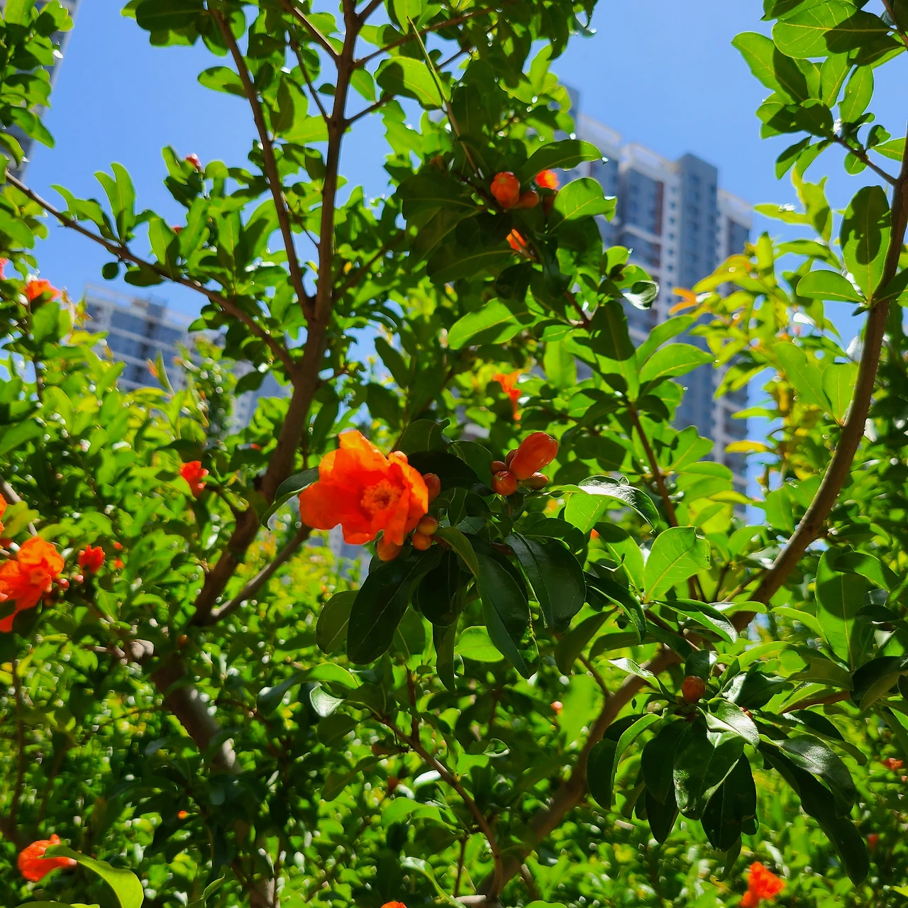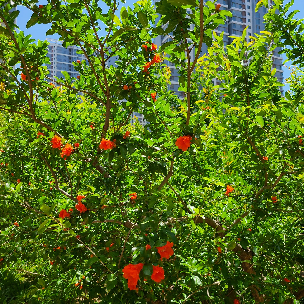 석류나무의 꽃은 짙은 초록색 잎들 사이에 아주 야무진 주황색이다.