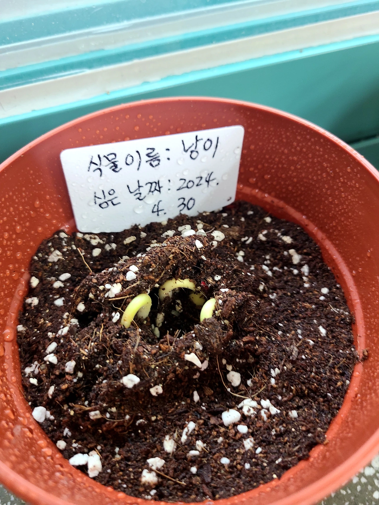 아침에 등교하면 교실에 들어와 가장 먼저 화분 쪽으로 다가간다. 며칠 동안 물을 살짝살짝 뿌리면서 화분 안을 들여다볼 때, 아무런 일이 없는 듯하다. 덮어둔 흙만 보인다. 그러던 어느 날, 사진 속의 이 광경을 목격했다.