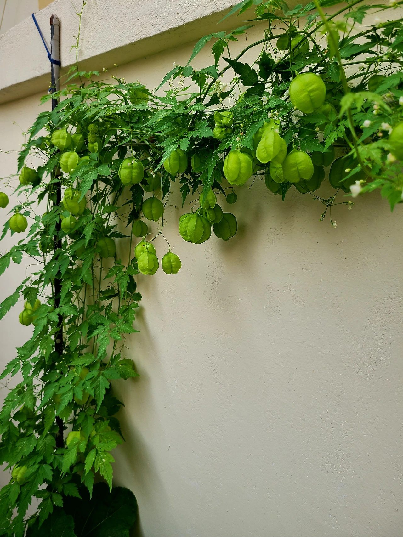 왼쪽 식물은 연둣빛 공처럼 부풀어있는 둥글둥글한 열매가 신기해서, 또한 아이보리 빛 담장을 타고 싱싱하게 뻗어 나가고 있는 모습이 대견해서 찍었다. 이름이 뭘까 검색해 보니 '풍선덩굴'이라고 불리는 식물이다. 모양새와 자라는 특성에 잘 어울리게 이름이 지어진 듯하다.