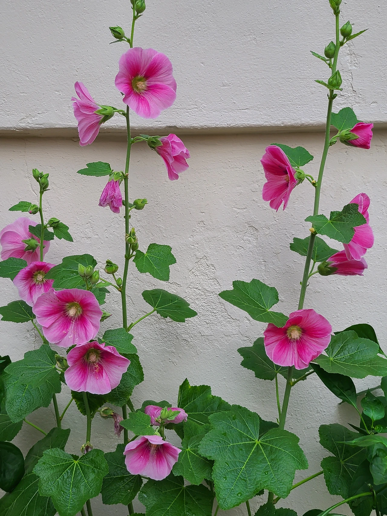 오른쪽 식물은 하얀 벽을 배경으로 핀 분홍꽃이 예뻐서 찍었다. 이 꽃은 이름을 알고 있는 듯하다. '접시꽃'.