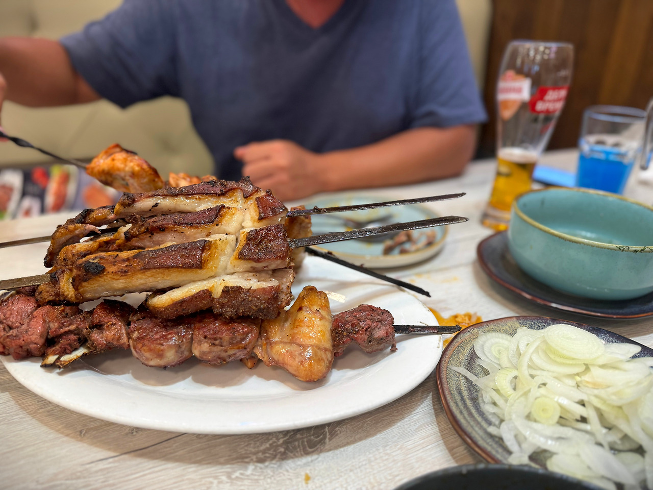 아침도 점심도 거른 채 달려온 터라, 점심 겸 저녁으로 현지인(에르킨 하우스의 딸)이 추천한 맛집으로 향했다. 음식은 하나같이 훌륭했지만, 샤슬릭의 크기를 미처 짐작하지 못한 채 세 개나 시킨 게 무리였다. 결국 꼬치 두 개를 거의 남기는 바람에, 남은 고기를 포장해 숙소로 돌아오는 길이었다.