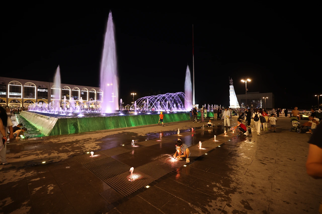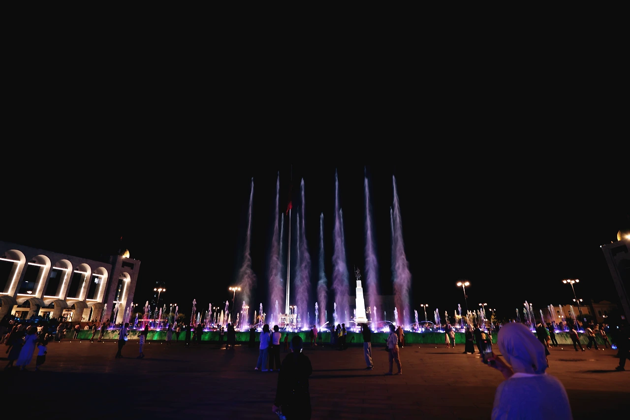 트리 액티비티를 마친 후, 우리는 어슬렁어슬렁 시내를 걸었다. 특별히 목적지가 있었던 건 아니었다. 여행의 마지막 도시였기에 그저 도시의 공기와 사람들의 표정을 느끼고 싶었다. 그러다 불현듯 눈앞에 넓은 광장이 펼쳐졌다. 바로 비슈케크의 중심, 알라투 광장(Ala-Too Square) 이었다. 광장 중앙의 분수대에서 물줄기가 리듬을 타며 솟구쳤고, 그 위로 조명이 색을 바꿔가며 밤하늘을 물들였다. 음악이 흘러나오고, 바람이 물방울을 실어와 얼굴에 닿았다.