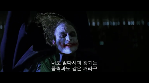 개봉한 지 10년이 넘었고, 그동안 수많은 히어로 영화가 나왔지만 왜 우리는 아직 <다크나이트>를 잊지 못할까. 여러 이유가 있지만 굉장히 큰 이유가 배트맨과 조커의 캐릭터성에서 기인한다. 그들의 관계는 여타 히어로 영화에서 등장하는 영웅과 악당처럼 단순하지 않다. 물리적인 힘은 좀 부족하지만 그들은 누구보다 강한 자신만의 신념으로 중무장했다. 그 신념의 충돌에는 영웅과 악당의 싸움을 넘어 선과 악, 질서와 혼돈 등 우리의 현실에서 논의되는 철학적인 개념이 대입될 수 있고 그것은 관객으로 하여금 깊이 고찰할 수 있는 여지를 준다. 이런 점에서 그들은 대단히 현실적인 캐릭터이다. 히어로물이라면 어쩔 수 없는 뻔한 권선징악과 현실과 동 떨어진 오락성의 한계를 넘어 현실적이고 철학적인 담론의 여지를 준다는 사실은 <다크나이트>를 차별화한다. 둘 다 아무런 초능력이 없다는 점도 현실적이다. 이런 점에서 볼 때 '조커'는 그 자체로 다른 악당들과 압도적으로 다르다. '조커'는 타노스처럼 누가 봐도 영화 속에서만 존재할 거 같은 캐릭터가 아니라 지금도 우리 주위에 있을 것 같은 '혼돈 그 자체'이다.