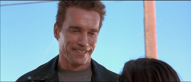 2편과 1편을 가장 차별화하는 요소는 T-800이다. 카메론 감독은 전편에서 극악무도한 악당이었던 T-800이 속편에서 영웅으로 등장하는 과감한 반전을 선보였다. <터미네이터>를 극장이 아니라 미디어로 먼저 접한 사람들은 T-800이 선역이라는 사실에 무덤덤할 수 있겠지만, 당시 이걸 극장에서 본 사람들에게는 아마 기겁할만한 반전이었을 것이라고 생각된다. 어쨌든 이 사실이 중요한 이유는 존 코너 일행과 T-1000간의 어느 정도 대등한 액션이 가능해졌다는 점이다. 사실 대등하다고 하기에는 T-1000이 너무 월등하지만 그래도 1편이랑 비교했을 때, T-800 덕에 어느 정도 시간 벌기가 가능해졌다. T-800과 T-1000이 선보이는 로봇 간의 액션은 1편에 없었던 요소로 관객에게 스릴 외에 또 다른 재미를 선사한다. 1편에서는 사라 코너와 카일 리스가 일방적으로 쫓기기만 해서 한편으로는 답답했을 관객들의 심리가 2편에서 그래도 악당에게 유효타를 날리는 T-800 덕에 보상된 측면도 있는 듯하다.