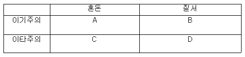 지금까지 나의 주장을 정리하고 나름대로 구체적인 대안 제시를 해본다면 이러하다. 일단 이 표는 위의 이야기를 도식화한 결과이다. A는 우리가 지금까지 갖고 있던 선입견으로 작가가 근현대의 발생한 5개의 대재난을 응시한 결과 아닐 수도 있다는 게 밝혀졌다. C는 작가가 발견한 것으로 사람들은 재난 이후 이타적이고 연대적이며 상호부조 하는 모습을 보였다. B는 현재 우리가 살아가는 일상이다. 그리고 마지막으로 D에 적절한 개인주의가 섞인 사회가 이 책을 읽은 나 자신이 생각하는 유토피아이다.