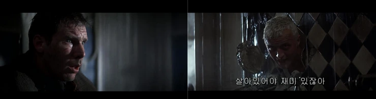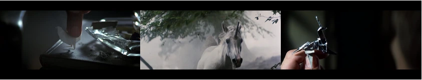 실제로 데커드는 마지막에 바닥에 떨어져있던 종이 유니콘을 보면서 무언가 깨달은 듯한 표정을 지으며 끄덕인다. 동시에 영화에서 왼쪽 그림의 가프의 대사 "그 여자가 죽게 돼서 안됐어. 하긴 누군 영원히 사나?"가 오버랩 된다. 이 대사는 데커드와 로이의 대결이 전달하는 메시지를 한 줄로 압축한 명대사이다. '인간이든 리플리컨트이든 기간의 차이는 있어도 결국 죽는 건 똑같다. 당신이 사랑하고 지키려 했던 그 여자도 결국 죽을 것이다. 당신이나 그 여자나 그동안 당신이 기를 쓰고 사냥해 온 리플리컨트들이나 별 다를 바가 없다.' 이런 의미로 해석할 수 있다.