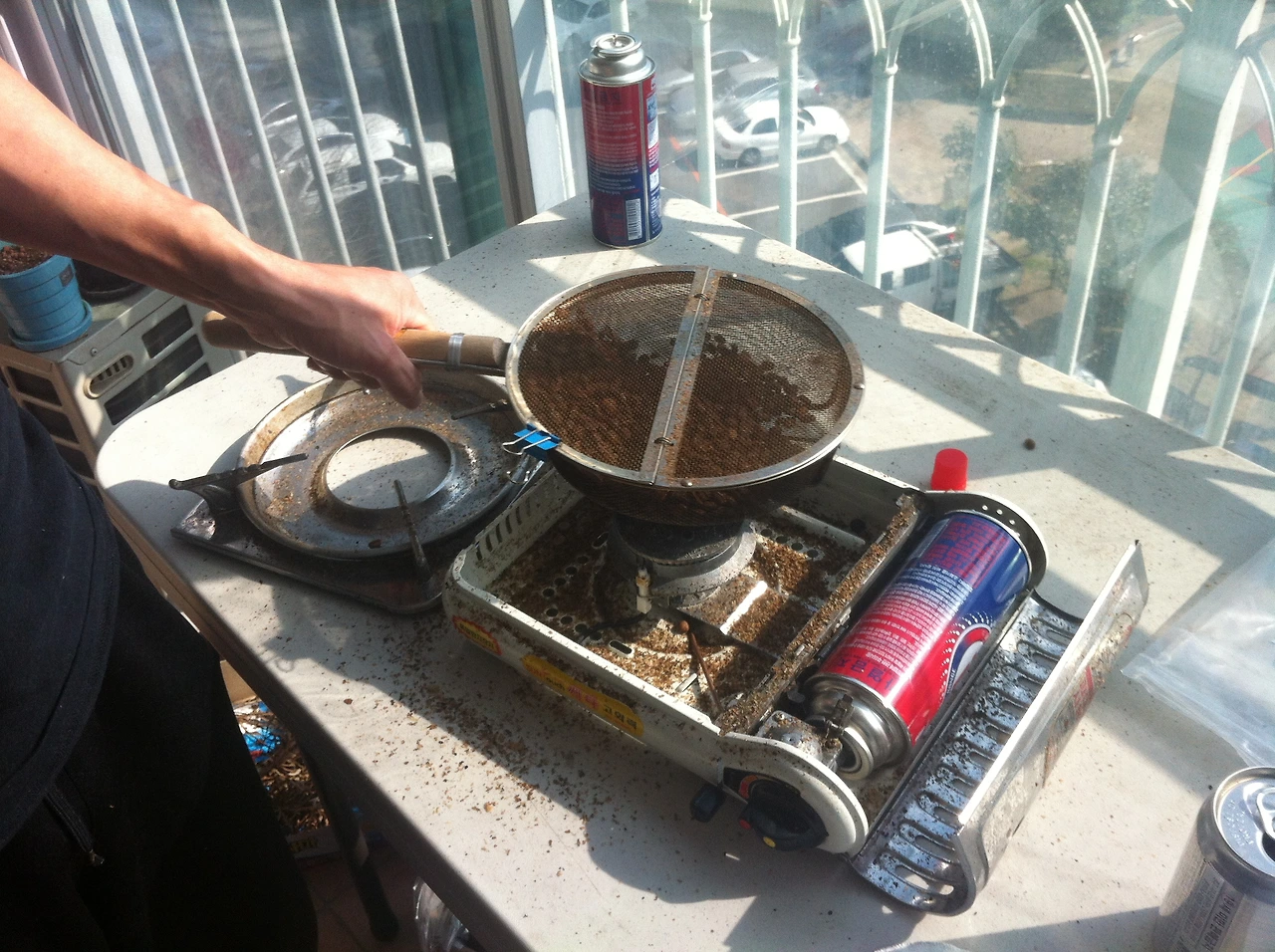 보통 수망 로스팅은 연기와 먼지 때문에 부엌에서 쫓겨나 베란다에서 하게 되는데 베란다는 집 실내 공간보다 외부 온도 변화에 민감해서 계절이 바뀔 때마다 로스팅 시간과 필요한 가스 양이 많이 차이 나게 된다. 로스팅을 마친 후에도 빨리 원두를 식혀야 하는데 겨울이면 베란다 문을 30초만 열어 두어도 거의 콩이 다 식는 반면 여름에는 오히려 실내 온도가 더 낮아 선풍기가 필요한 경우도 있다.