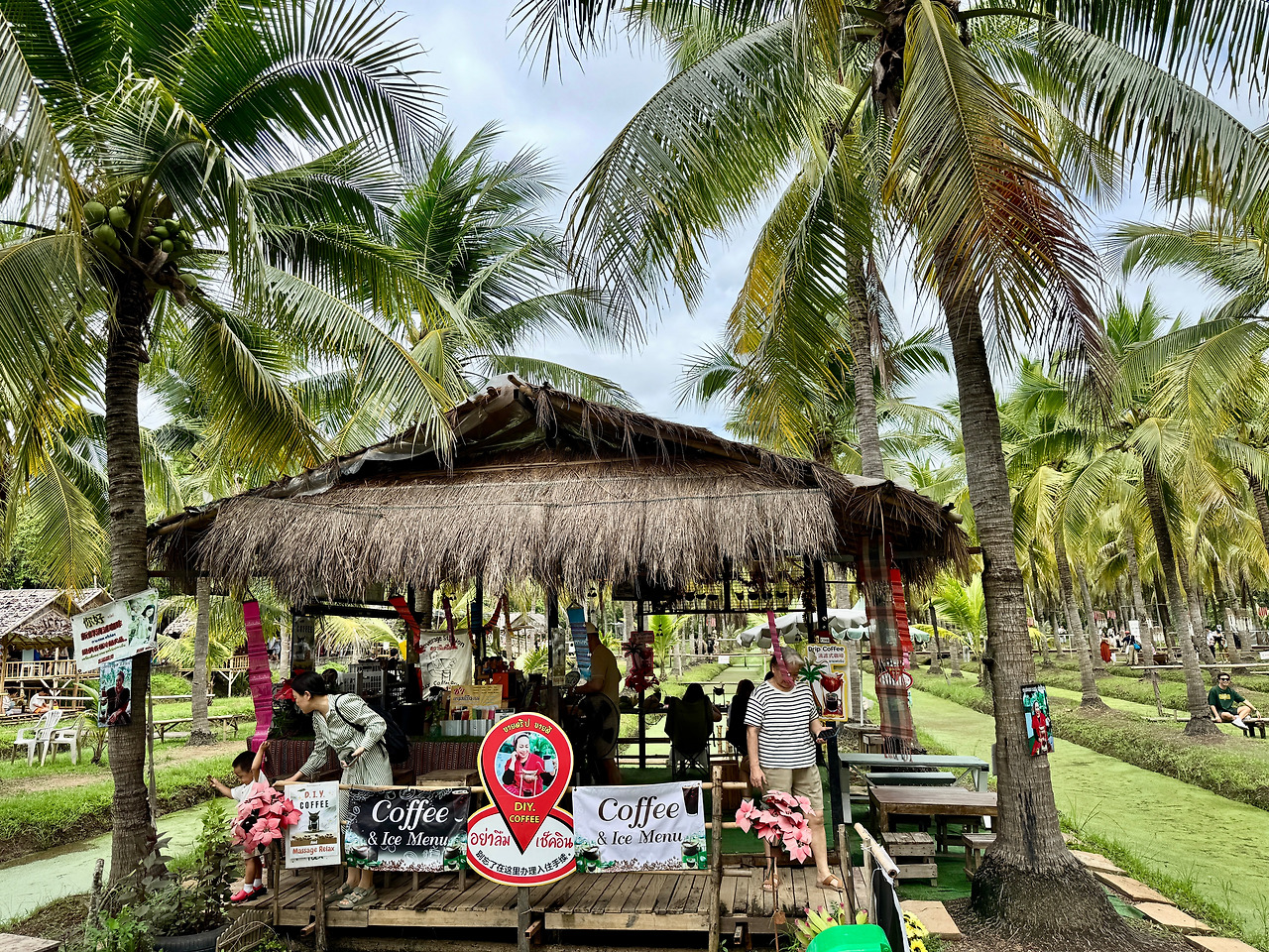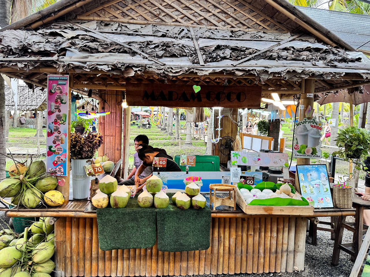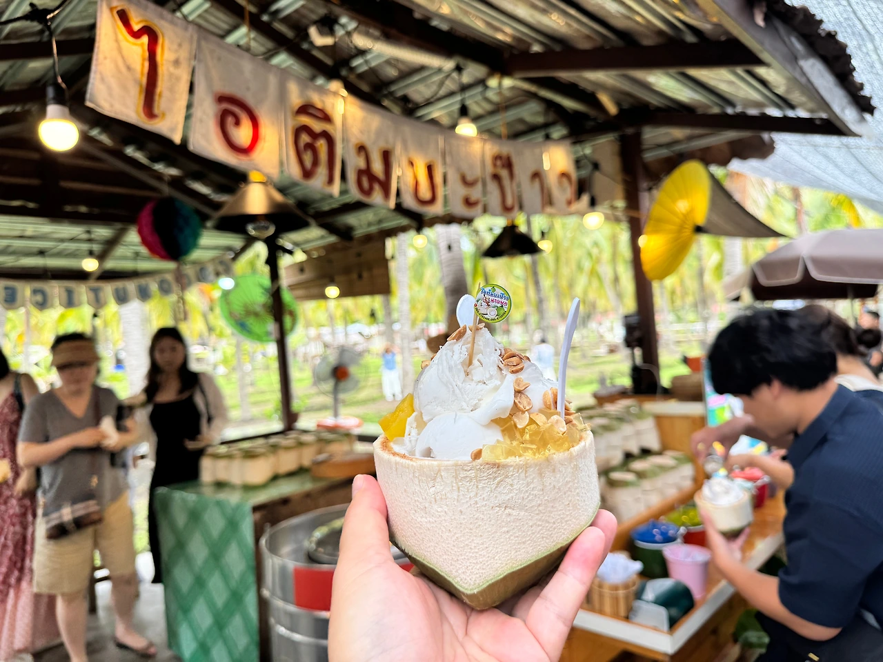 이곳에서의 시간은 예상보다 훨씬 여유롭고 힐링된다. 농장 가장자리를 따라 ㄷ자로 늘어선 가판대들을 구경하는 재미가 쏠쏠하다. 팟타이 볶는 향기가 풍기는 음식 부스에서 열대과일 스무디를 파는 과일 가게까지, 마치 야시장 전체가 야자수 농장으로 이사를 온 듯하다. 가판대를 구경하다 지치면 농장 중앙의 야자수 그늘 아래 놓인 대나무 의자에 앉아 시원한 코코넛 워터나 갓 내린 드립커피를 마시며 쉴 수 있다. 도시의 소음에서 완전히 벗어나 새소리와 코코넛 나무 잎사귀 스치는 소리만 들리는 이 순간이야말로 진정한 휴식이다. 특히 오후가 되면 코코넛 나무들이 만드는 그늘이 더욱 깊어져 자연 에어컨 같은 시원함을 선사한다. 가장 추천하는 코스는 오전 일찍 도착해 사진부터 실컷 찍고, 코코넛 나무 숲 산책을 즐긴 뒤, 다양한 간식을 맛보며 커피 한 잔으로 마무리하는 것이다.