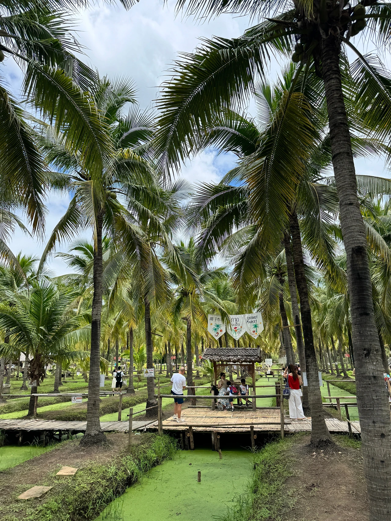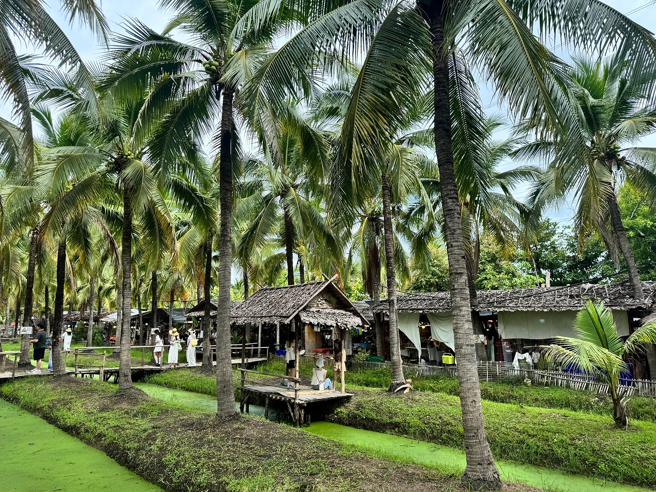 기대했던 것보다 훨씬 놀랍고 아름다운 곳이었다. 실제로는 인스타그래머들의 성지 같은 곳이다. 농장 중앙에 서 있는 거대한 코코넛 나무들 사이사이를 걸으며 사진을 찍는 것이 이곳 최대의 이벤트다. 키 높은 코코넛 나무들이 만들어내는 자연스러운 프레임, 가장자리로 늘어선 알록달록한 가판대들이 배경이 되어주는 컬러풀한 구도, 그리고 열대 과일 주스를 들고 포즈를 취하는 완벽한 트로피컬 인증숏까지. 특히 오전 햇살이 코코넛 나무 잎사귀 사이로 스며들 때의 빛은 어떤 필터보다도 아름답다. 절대 흔하게 찍을 수 없는 이국적인 배경이 SNS 피드를 단숨에 업그레이드시켜 준다. 현지 치앙마이 젊은이들도 주말마다 이곳으로 인생사진을 찍으러 오는 인기 스폿이다.