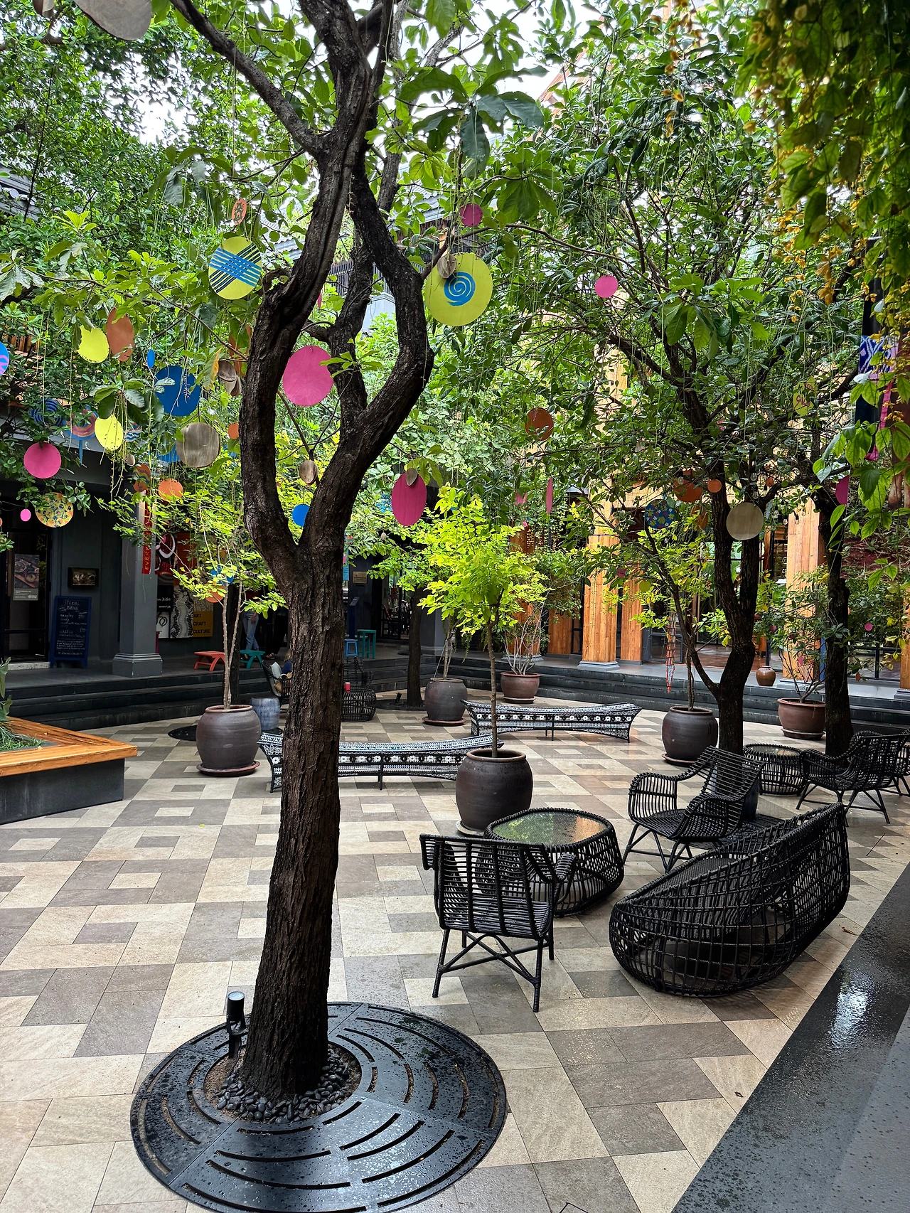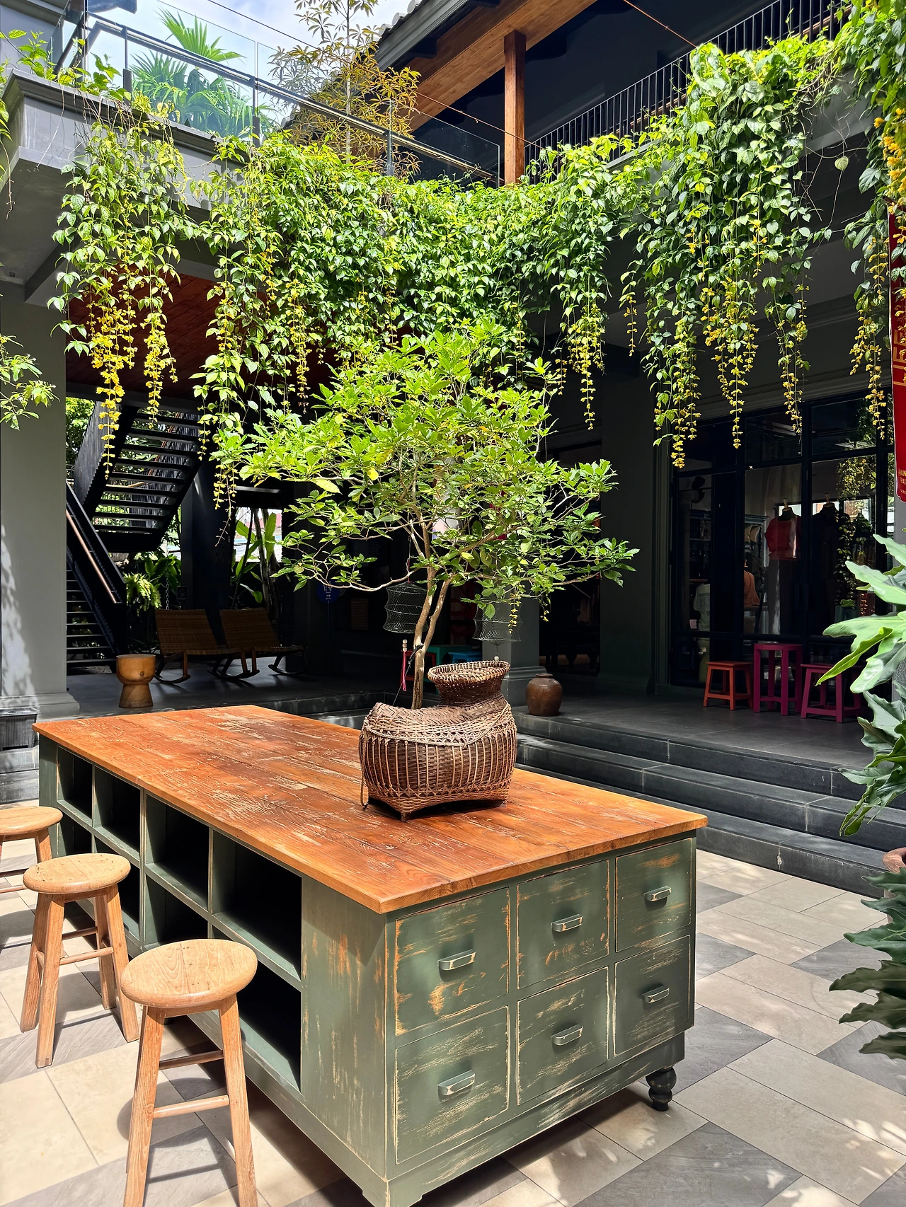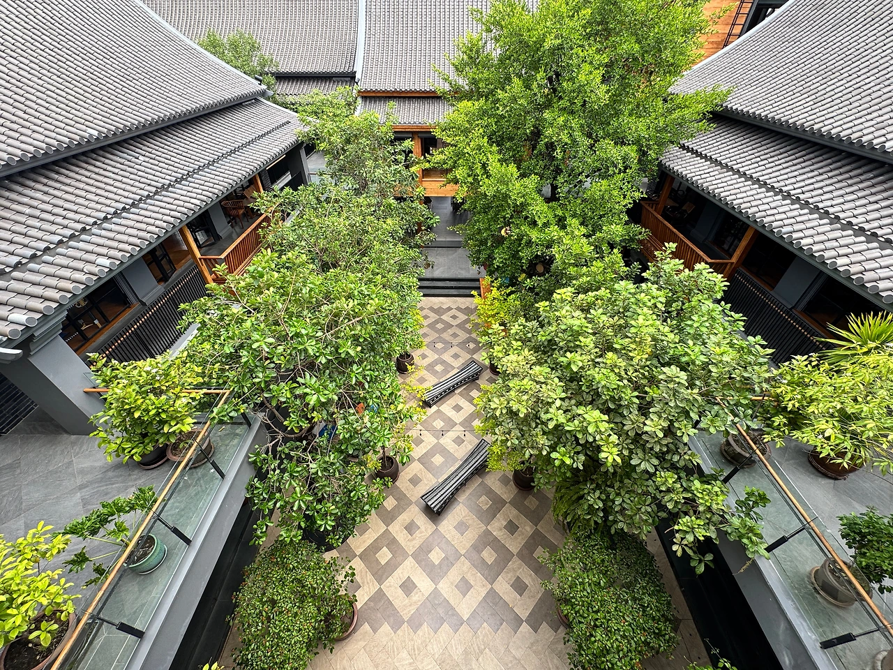 3층에서 내려다본 중정의 풍경이 마음을 재구성하기 시작한다. 발아래로 펼쳐지는 것은 단순한 마당이 아니라 이곳 공간의 숨겨진 보석 같은 전망이다. 다이아몬드 패턴으로 깔린 바닥 타일 위에 두 개의 검은 벤치가 정갈하게 놓여 있고, 그 주변을 무성한 녹음이 감싸고 있다. 건물 높이만큼 자란 나무들이 중정을 가득 채우며 자연스러운 차양막 역할을 하고, 회색 기와지붕들이 사각형을 그리며 이 비밀스러운 정원을 보호하고 있다. 뒤를 돌아보면 눈앞에 펼쳐진 풍광은 치앙마이 구시가지의 기와지붕들이 물결처럼 일렁이고, 멀리 사원의 황금 첨탑이 오후 햇살에 반짝이며 고개를 내밀고 있는 장관이다. 이 높이에서 바라보는 치앙마이 올드시티의 마천루는 그야말로 시간이 겹겹이 쌓인 도시의 연대기 같다. 이 높이에서만 들리는 도시의 숨소리 속에서, 어느새 외부 관찰자에서 이 공간과 도시의 일부가 되어가는 자신을 발견한다.