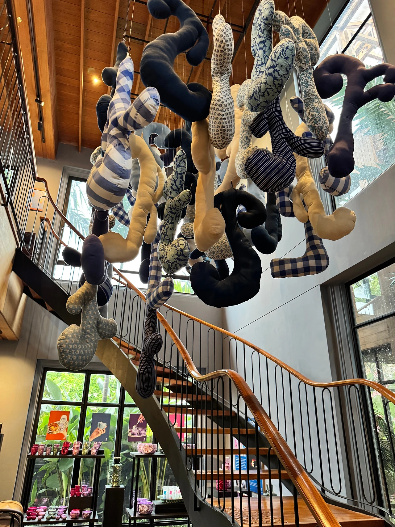 검은 벽돌 사이로 스며드는 오후의 빛이 중정에 얹힌 다채로운 천들을 흔든다. 무지개색 실크가 바람에 춤추며 목조 기둥 사이를 떠도는 동안, 어디선가 스며오는 찻잎 우리는 소리와 함께 시간이 다른 속도로 흐르기 시작한다. 발끝으로 전해지는 석재 바닥의 차가운 감촉과 코끝에 스미는 오래된 티크목의 따뜻한 향이 뒤섞이며, "Keep Kalm, Keep Craft Alive"라는 연두색 깃발이 바구니 짜기 패턴을 닮은 벽면에서 조용히 흔들린다. 이곳이 단순한 관광지가 아니라는 것을 직감하는 순간, 공간 자체가 하나의 조용한 선언처럼 다가온다.