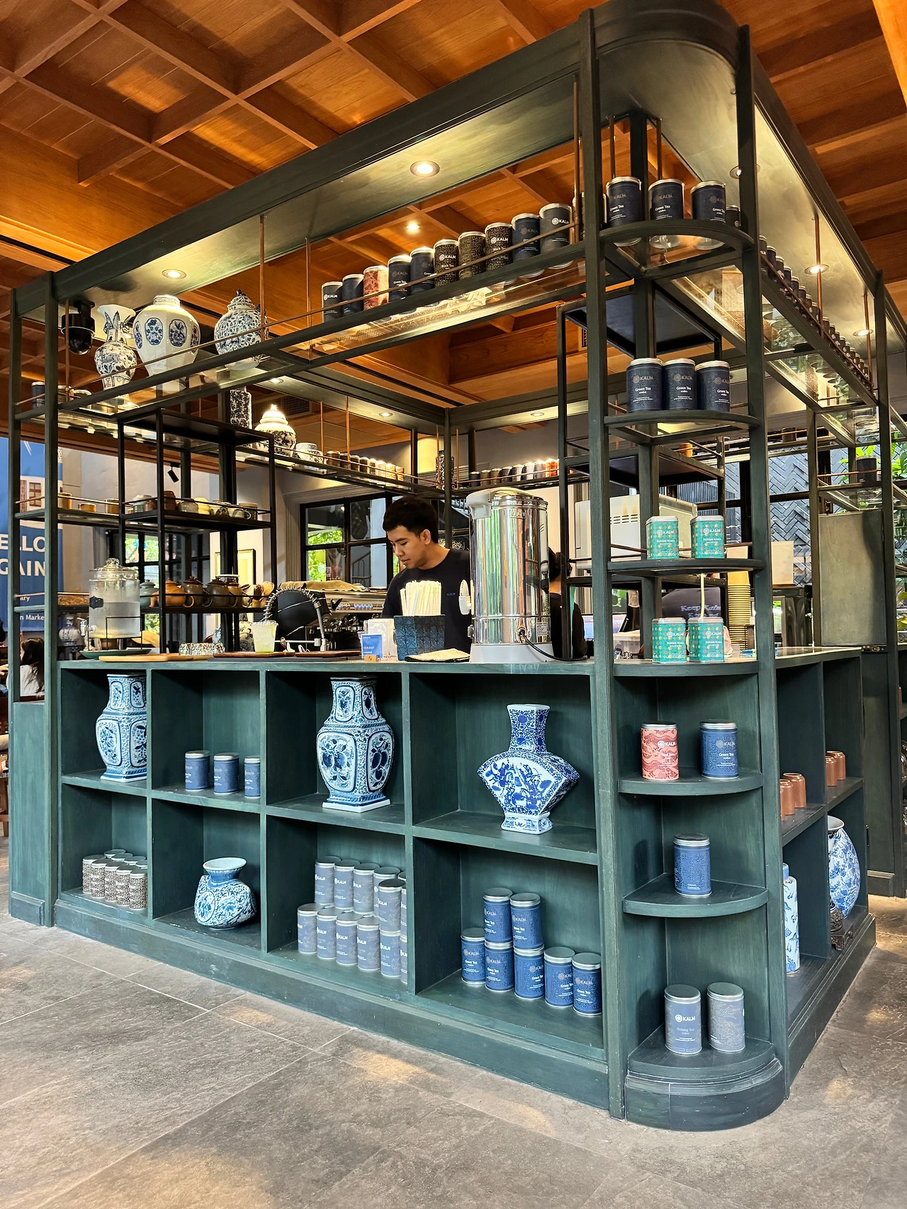 그런데 막상 들어서니 예상했던 '조용한 전시 공간'과는 다른 풍경이 펼쳐진다. 중정에는 서로 다른 높이의 테이블과 의자들이 느긋하게 배치되어 있고, 녹색 빈티지 캐비닛 테이블에서는 누군가 노트북을 열어둔 채 천천히 커피를 마시고 있다. 무성한 화분들 사이로 자연스럽게 놓인 나무 의자에서는 방문객이 책을 읽으며 오후 시간을 흘려보내고 있다. 카페 공간의 진초록 선반에는 청화백자와 현대적 디자인의 찻잔들이 차곡차곡 정리되어 있고, 바리스타의 손놀림에서 묻어나는 수십 년 내린 커피의 내공이 공간을 채운다.