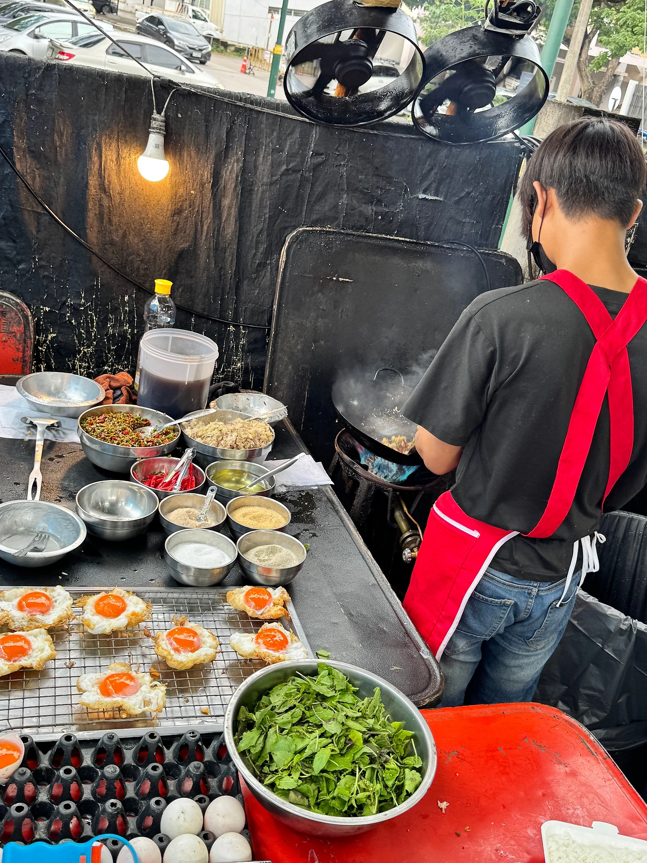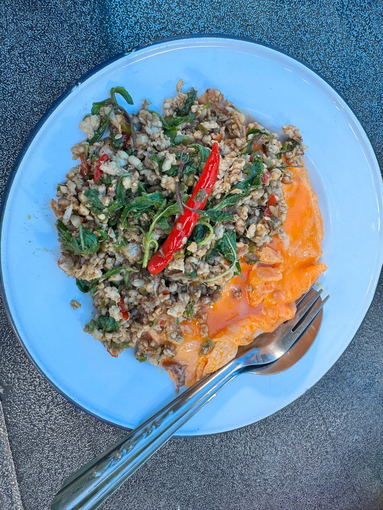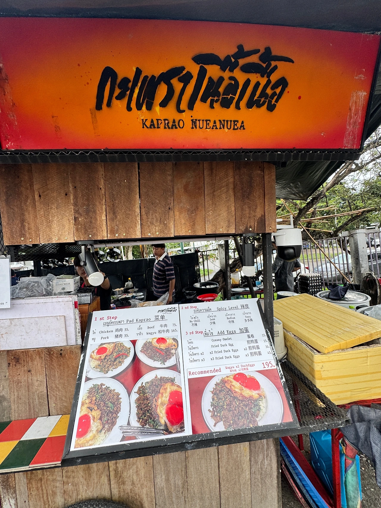 조용한 캠퍼스 호수에서, 후문 방향으로 30분정도 발걸음을 옮기면 분위기가 완전히 다른 랑머야시장이 나타난다. 랑머야시장은 학구적 캠퍼스 분위기와는 정반대의 생동감으로 넘쳐난다. 치앙마이대학교 후문 야시장이라고 불리는 이곳은 늦은 오후, 천천히 열리기 시작하여 오후 5시부터 밤 11시까지 본격적인 활기를 띤다. 플라스틱 의자에 앉아 솜땀을 먹는 대학생들 옆으로, 형광등 불빛 아래에서 팟타이를 볶는 아주머니의 손놀림이 춤추듯 빠르다. 특히 빨간 간판의 '카프라오 느아느아(Kaprao Nueanuea)' 가게에서는 홀리바질과 다진 소고기를 볶은 팟카프라오가 철판 위에서 지글거린다. 이 요리는 태국에서 가장 대중적인 음식 중 하나로, 태국 현지인들도 식당에 가서 "뭐 먹지" 할 때 가장 많이 찾는 대중적인 음식이며, 한국인들의 입맛에도 잘 맞는다. 매콤한 홀리바질의 향과 소고기 또는 닭고기나 돼지고기가 어우러져 후각이 먼저 포만감을 느끼게 만든다. 계란후라이와 함께 흰 쌀밥 위에 올려지는 이 한 그릇 요리는 기본 55-75바트에 판매되며, 대학생들의 든든한 한 끼가 되어준다. 고추와 마늘이 기름에 지글거리는 소리, 얼음이 부딪히며 만들어내는 청량한 소음, 오토바이 엔진음이 뒤섞여 만들어내는 태국 밤거리의 교향곡이 공기를 가득 메운다.