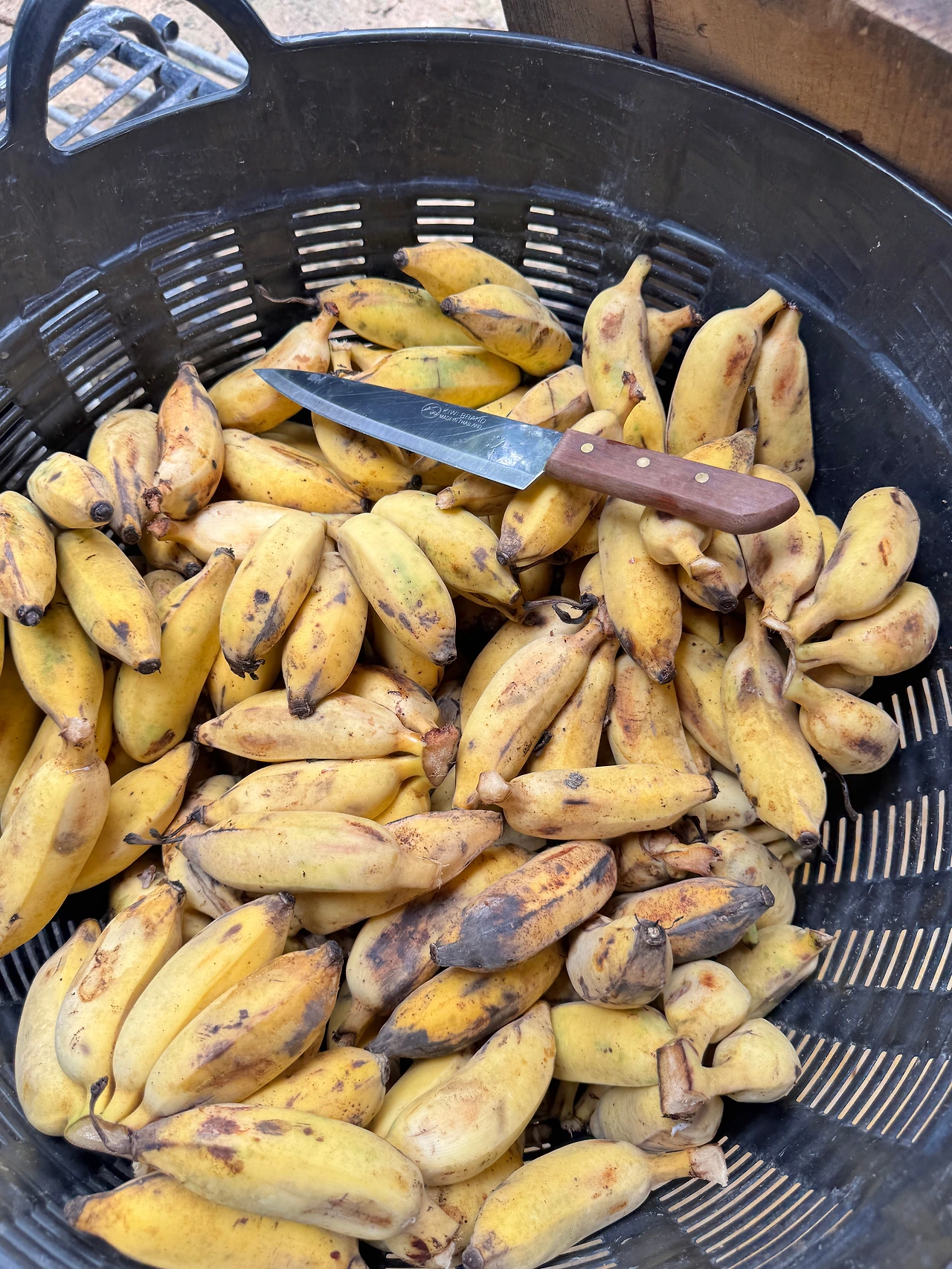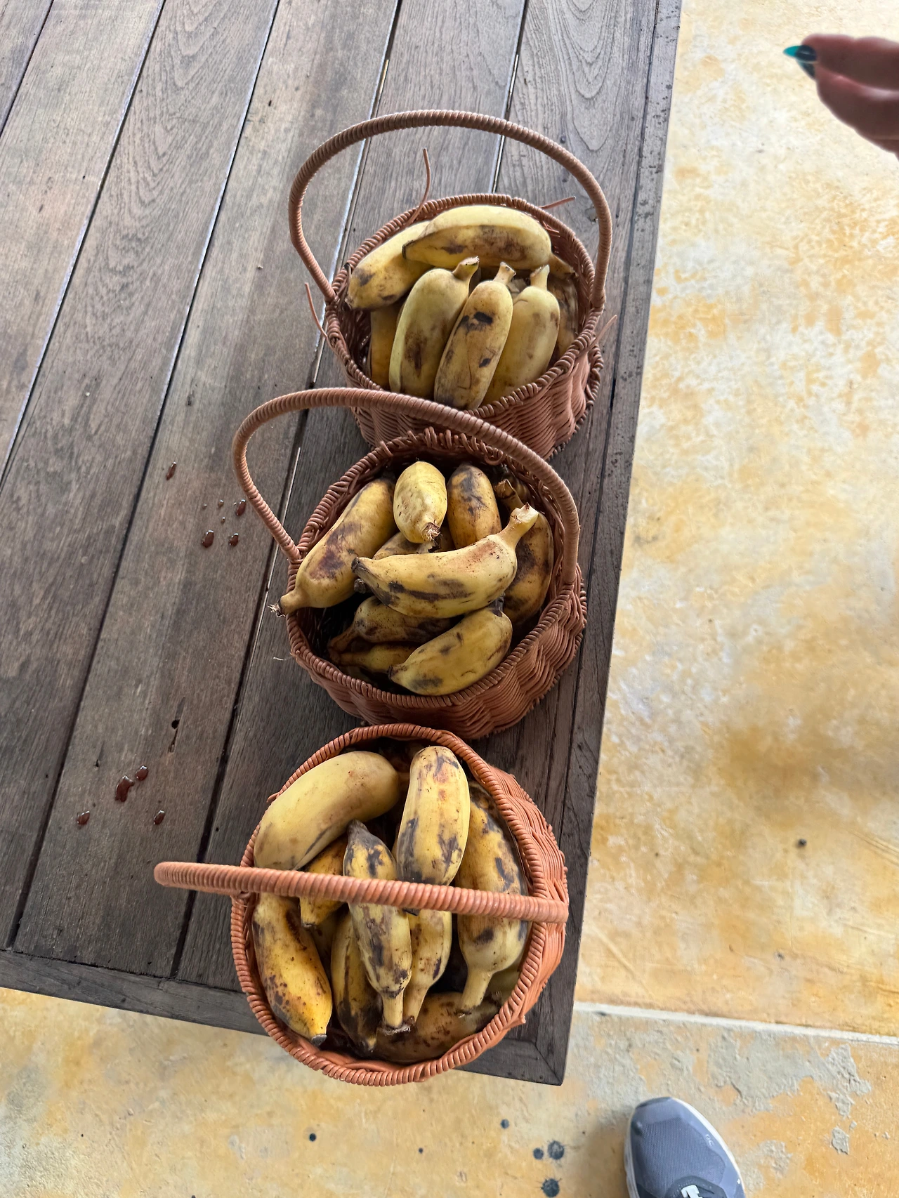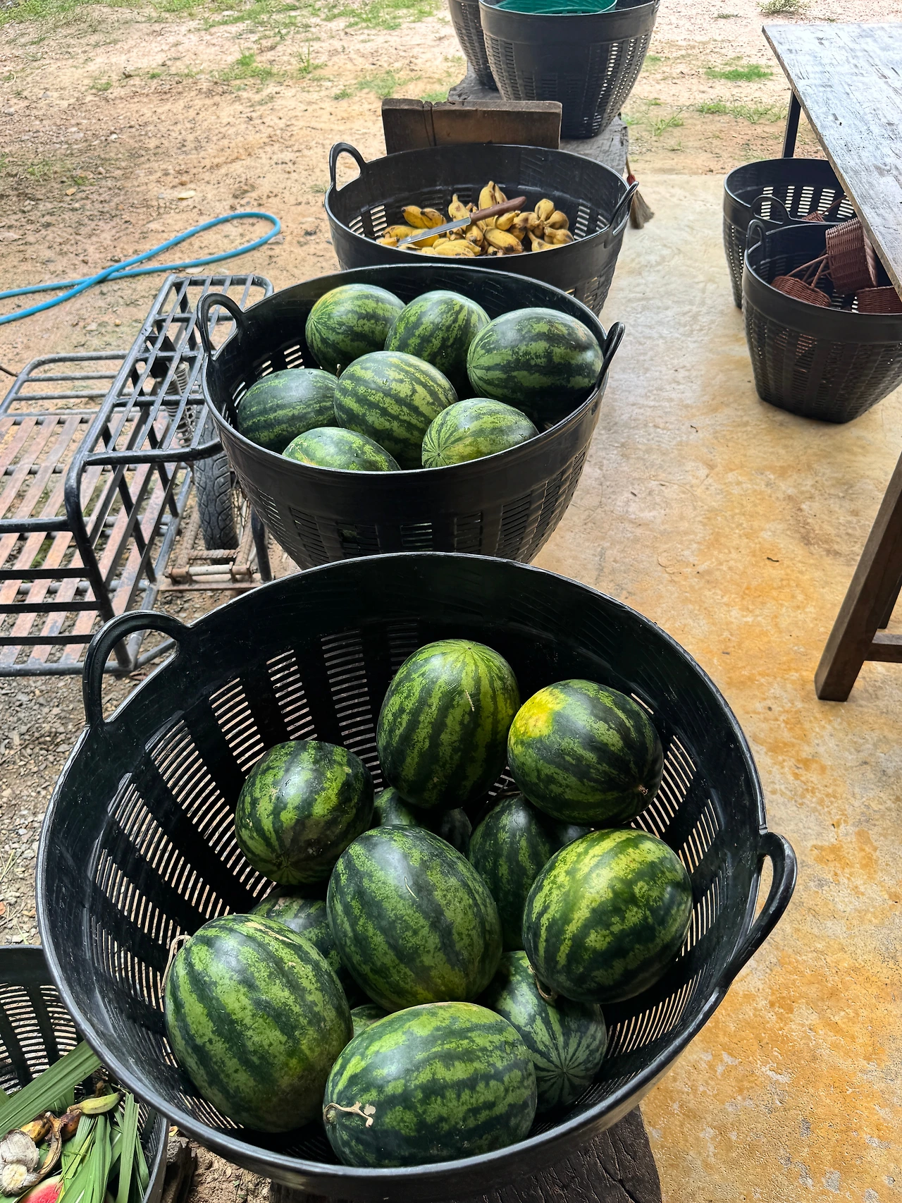갈색 등나무 바구니 안에 가득 담긴 황금빛 바나나들이 치앙마이 햇살 아래 달콤한 향기를 풍기고, 옆 바구니의 수박들은 짙은 녹색 줄무늬가 마치 지구본처럼 둥글게 돌아가며 무게만으로도 거대한 코끼리의 하루 식사량을 짐작케 한다. 하얀색과 연한 블루 투톤 상의를 입은 가이드가 웃으며 바구니를 건네며, 손짓과 목소리로 코끼리가 입을 벌리고 코로 인사하도록 하는 소통법을 보여준다. 하루 20시간을 먹는 데 사용하며 100kg에 육박하는 식사량을 소화해야 하는 이들에게 이 순간은 단순한 먹이 시간이 아닌 진정한 교감의 시작이며, 머드 스파를 함께 하고 강가에서 목욕을 시켜주는 체험 속에서 인간과 코끼리 사이의 특별한 유대감이 형성된다.