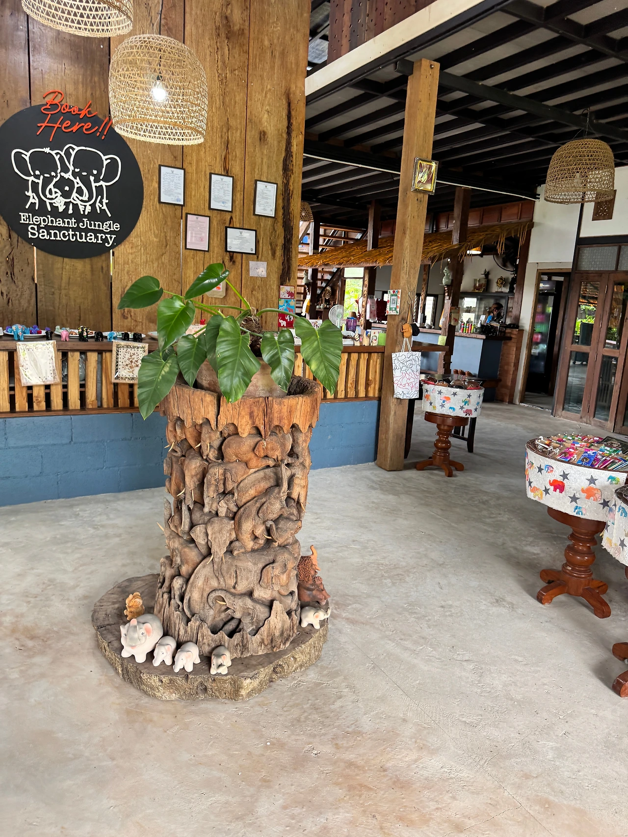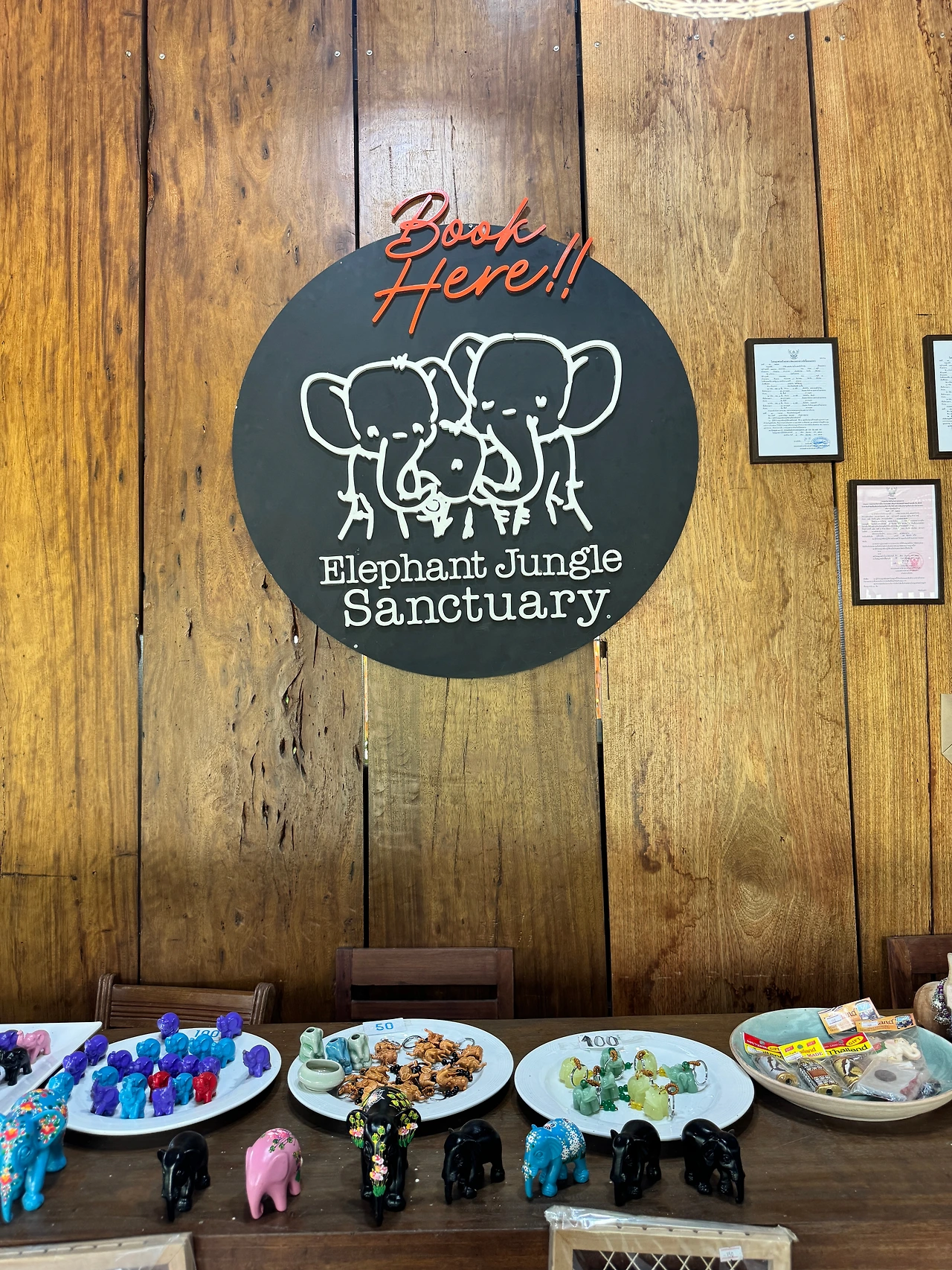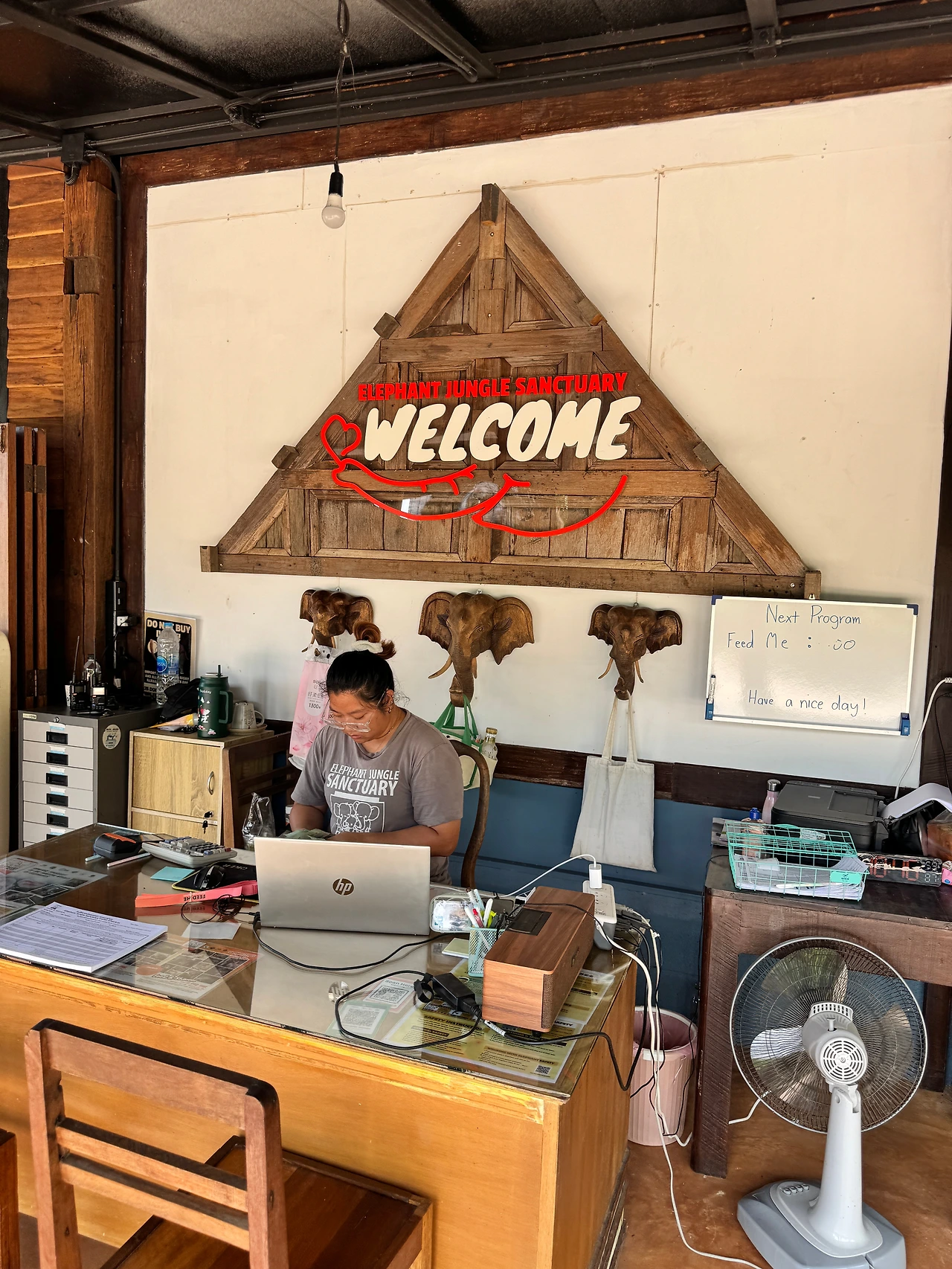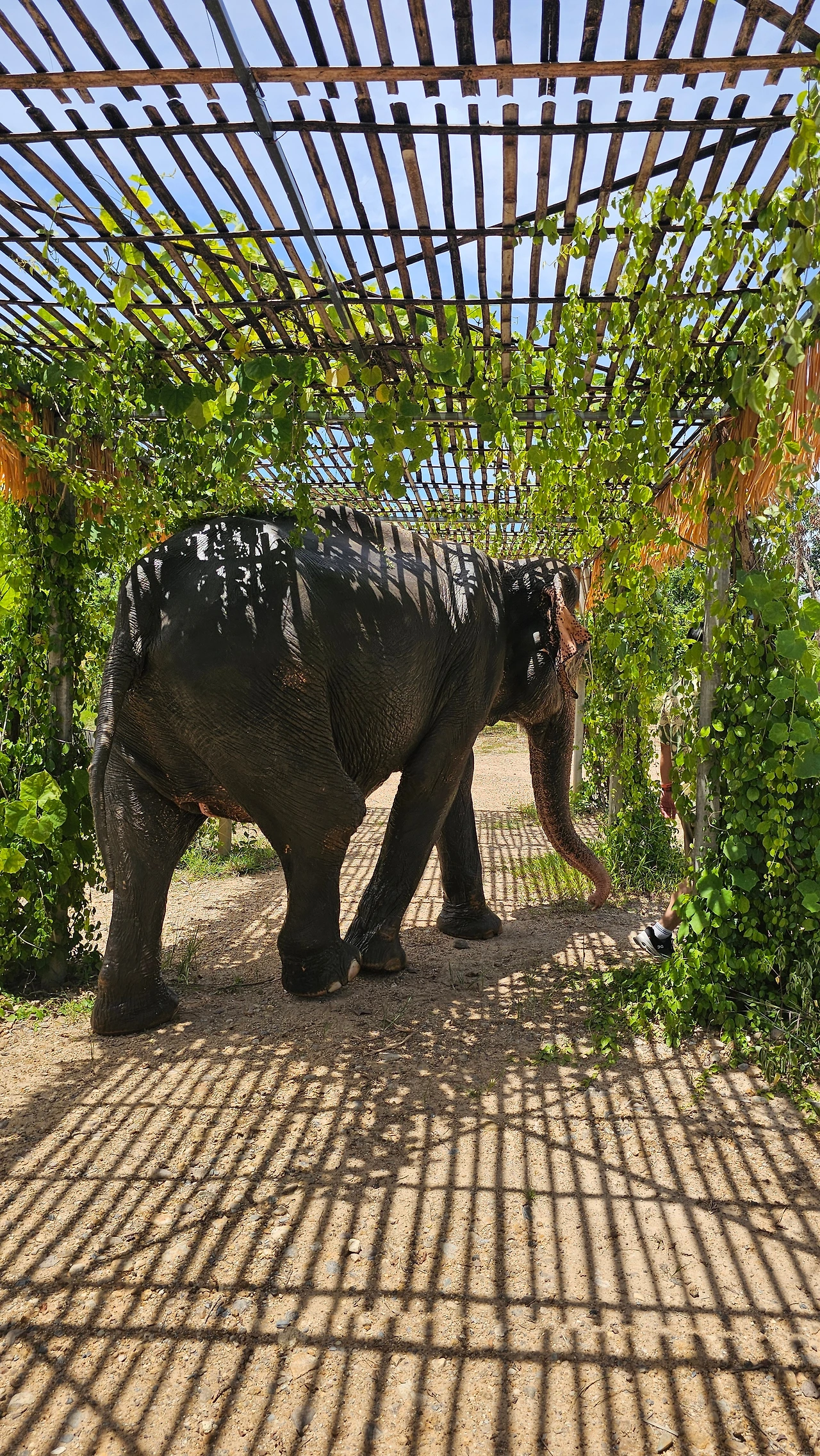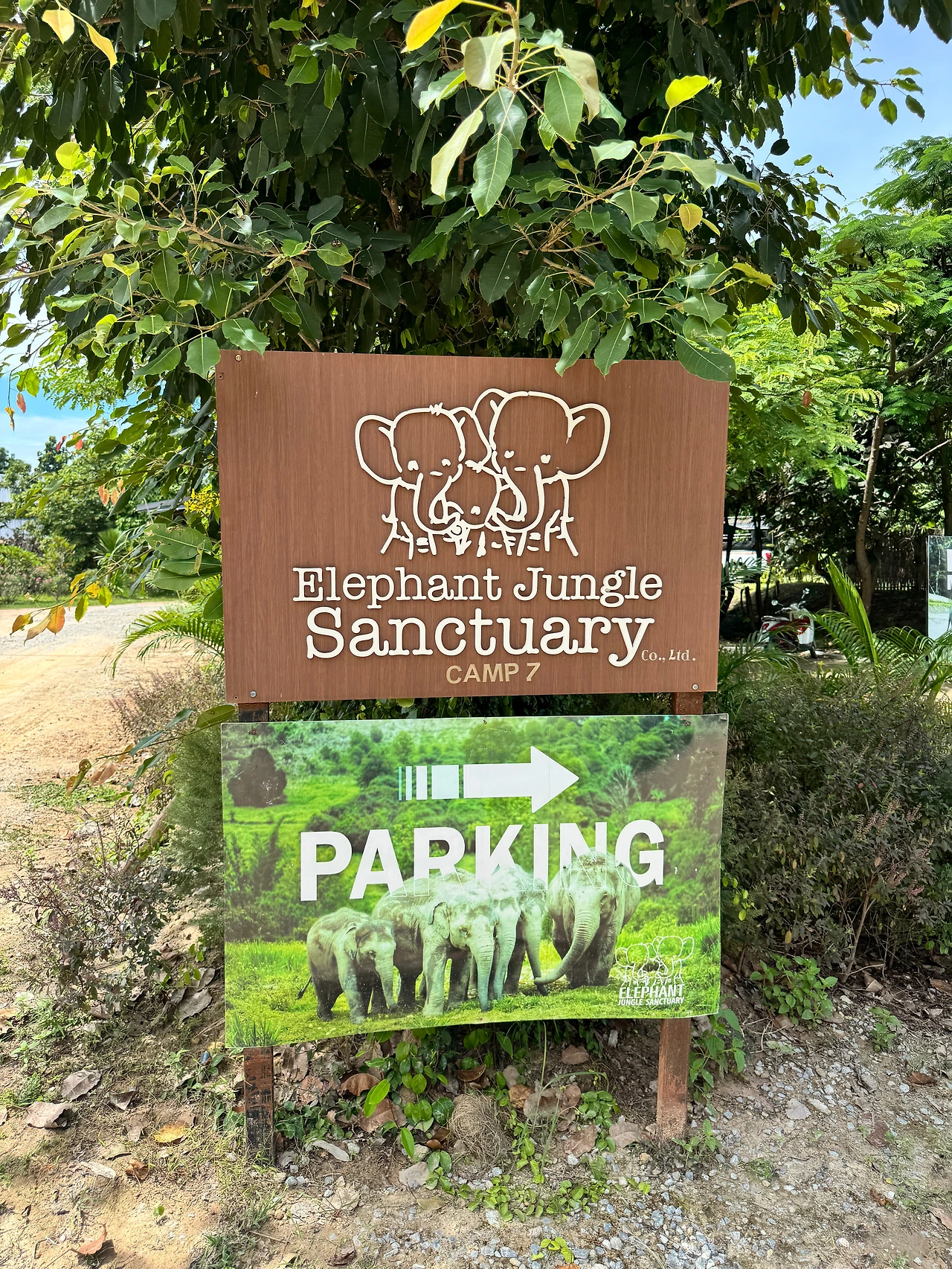 아침 9시, 치앙마이 시내에서 1시간 30분 거리. 엘리펀트 정글 생츄어리 Camp7 간판 앞에서 들리는 건 오전 정글의 숨소리다. 마른 나뭇잎이 바스락거리는 소리 사이로 멀리서 들려오는 코의 울림. 그것은 트럼펫도, 경적도 아닌 거대한 생명체가 내뿜는 기쁨의 선언이다. 갈색 나무 간판 위로 떨어지는 아침 햇살이 'PARKING' 글자 위의 코끼리 가족사진을 비추며, 초록빛 야자수 잎새들이 바람에 살랑거린다. 콘크리트 바닥에 흩어진 마른풀들과 자갈 사이로 보이는 나무 구조물 너머로 공기 중에 섞인 흙냄새와 바나나 향이 60세 고령 코끼리의 존재를 예고하고 있다.