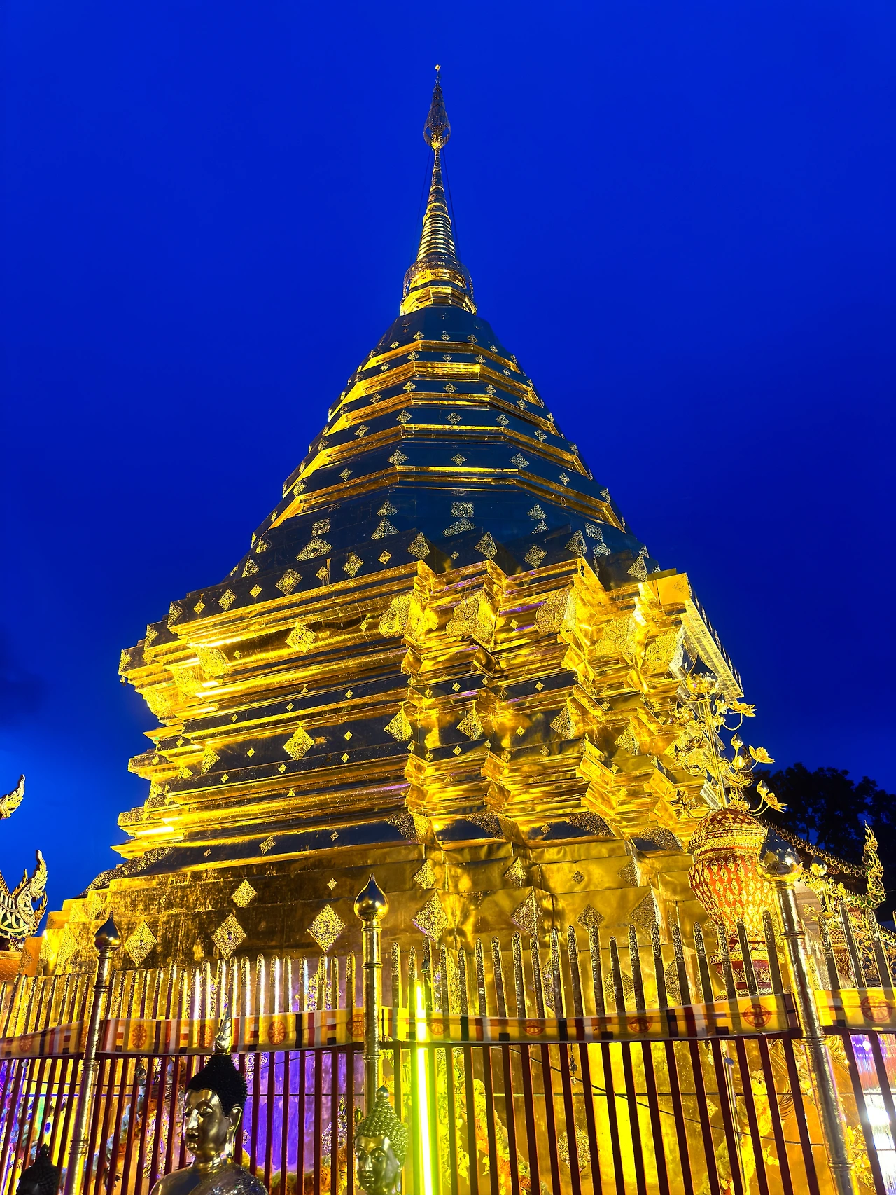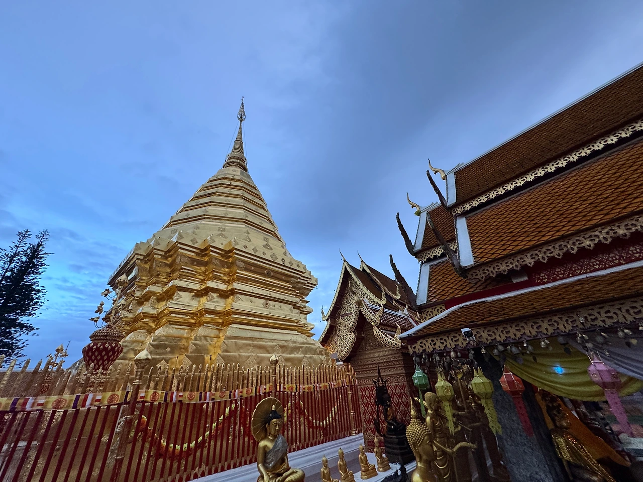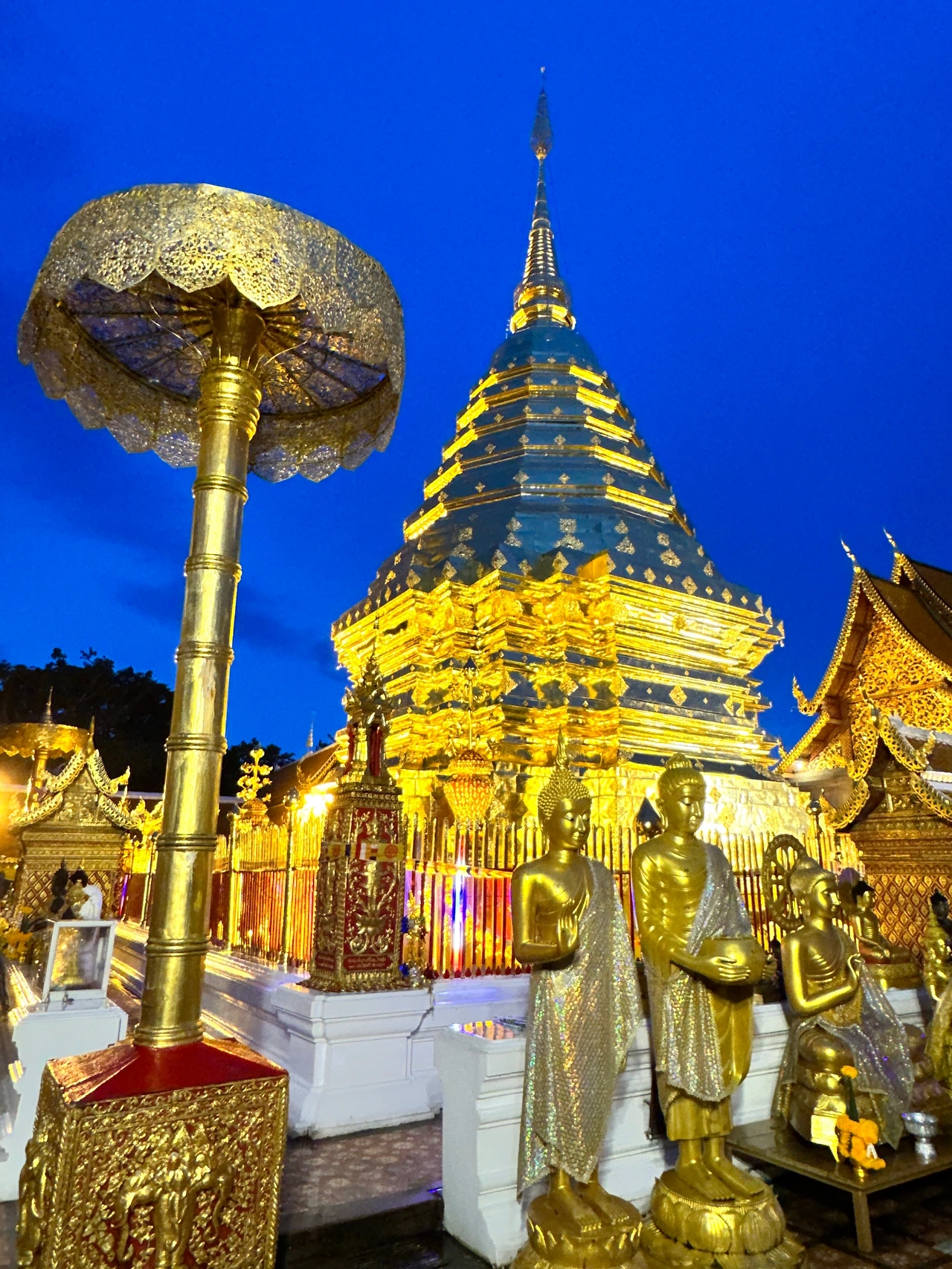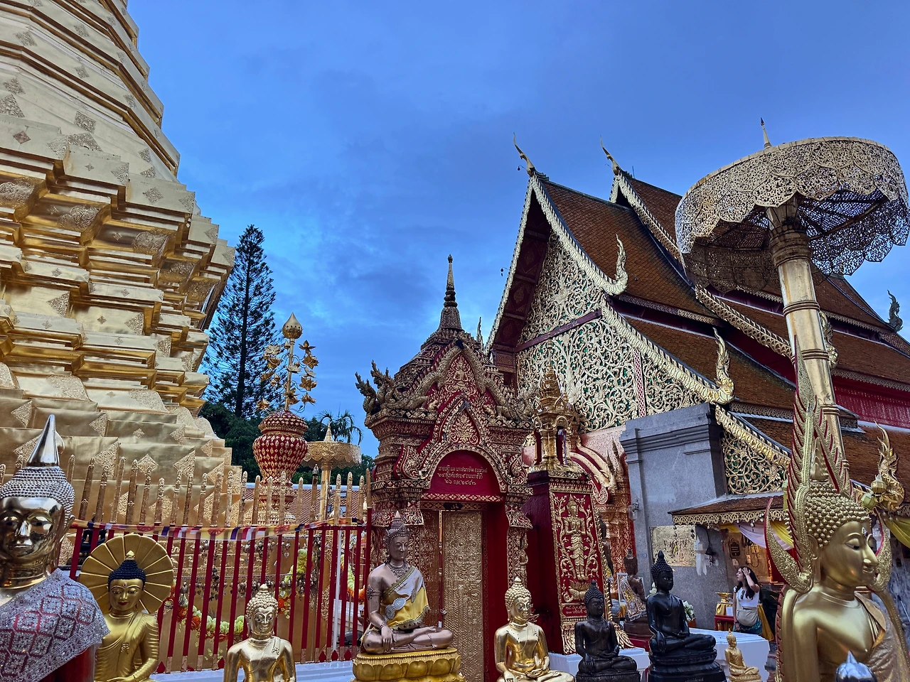 해가 서쪽으로 기울고 어둠이 찾아오면서 도이 스텝은 완전히 다른 얼굴을 드러낸다. 조명이 하나둘 켜지기 시작하자 주간의 화려함이 야간의 환상으로 변모한다. 황금빛 체디가 깊고 짙은 코발트블루 하늘을 배경으로 찬란하게 빛나는 순간, 숨이 멎을 듯한 아름다움에 압도된다. 14세기 란나 왕국 시대부터 부처의 사리를 모셔온 거대한 체디 주변으로 배치된 황금 불상들이 조명을 받아 마치 살아서 움직이는 듯하다. 연꽃 자세로 앉아 명상에 잠긴 불상들의 자비로운 미소가 황금빛 후광 속에서 더욱 신성하게 빛난다. 정교한 우산 장식들이 조명을 받아 레이스처럼 섬세한 그림자를 만들어내고, 사원 곳곳의 장식들이 금박을 입은 듯 눈부시게 반짝인다. 이 순간, 란나 왕국 700년 역사의 모든 기예와 신앙이 하나의 완벽한 예술작품으로 완성되어 있음을 깨닫는다.