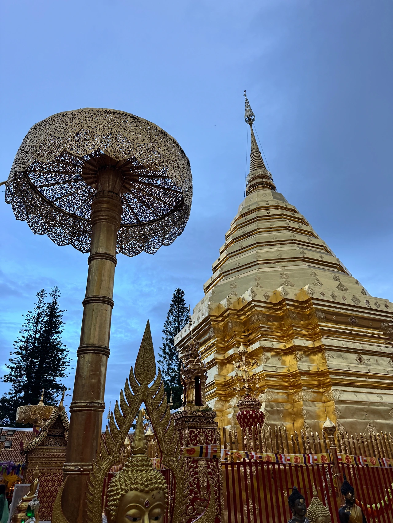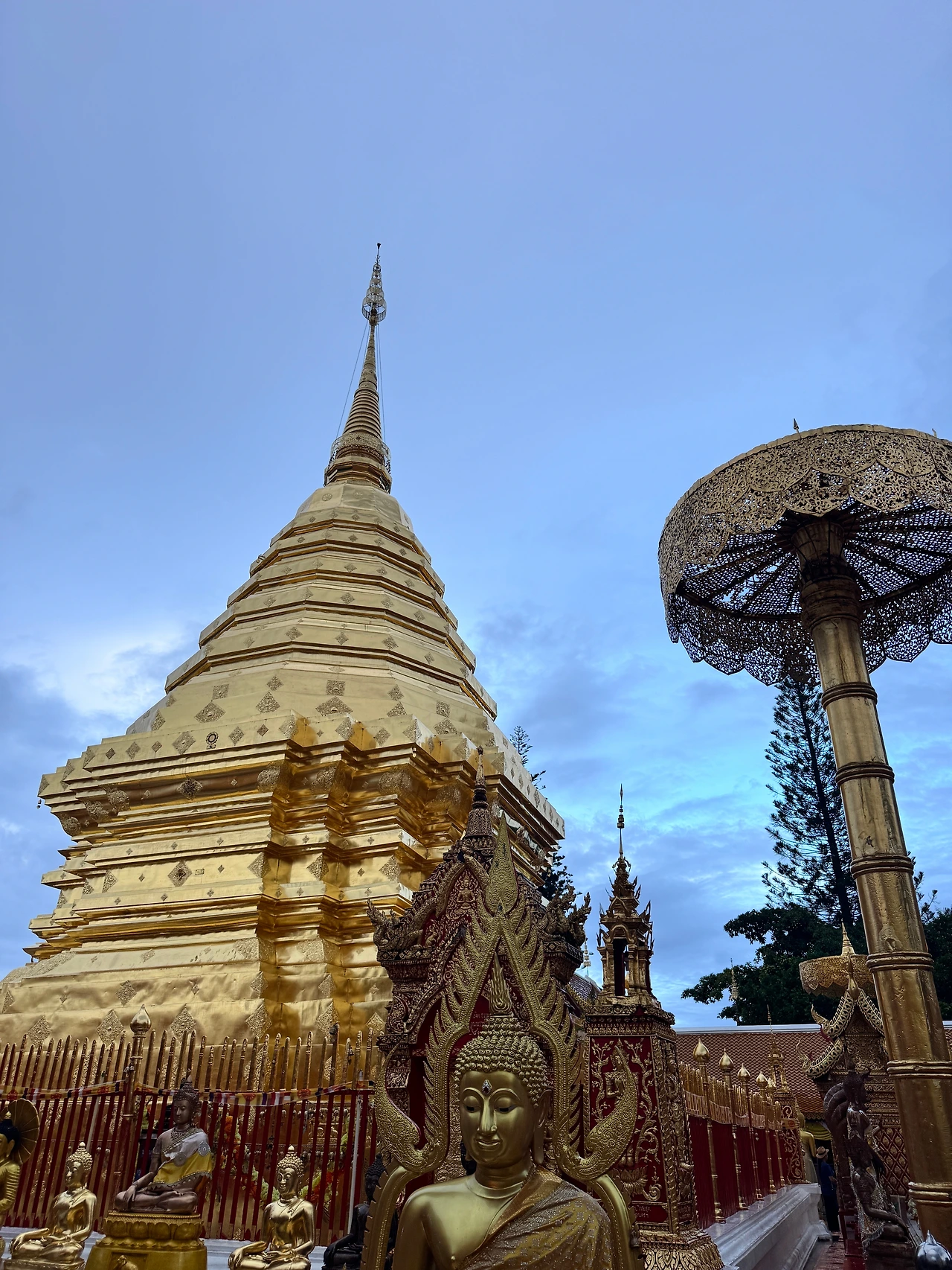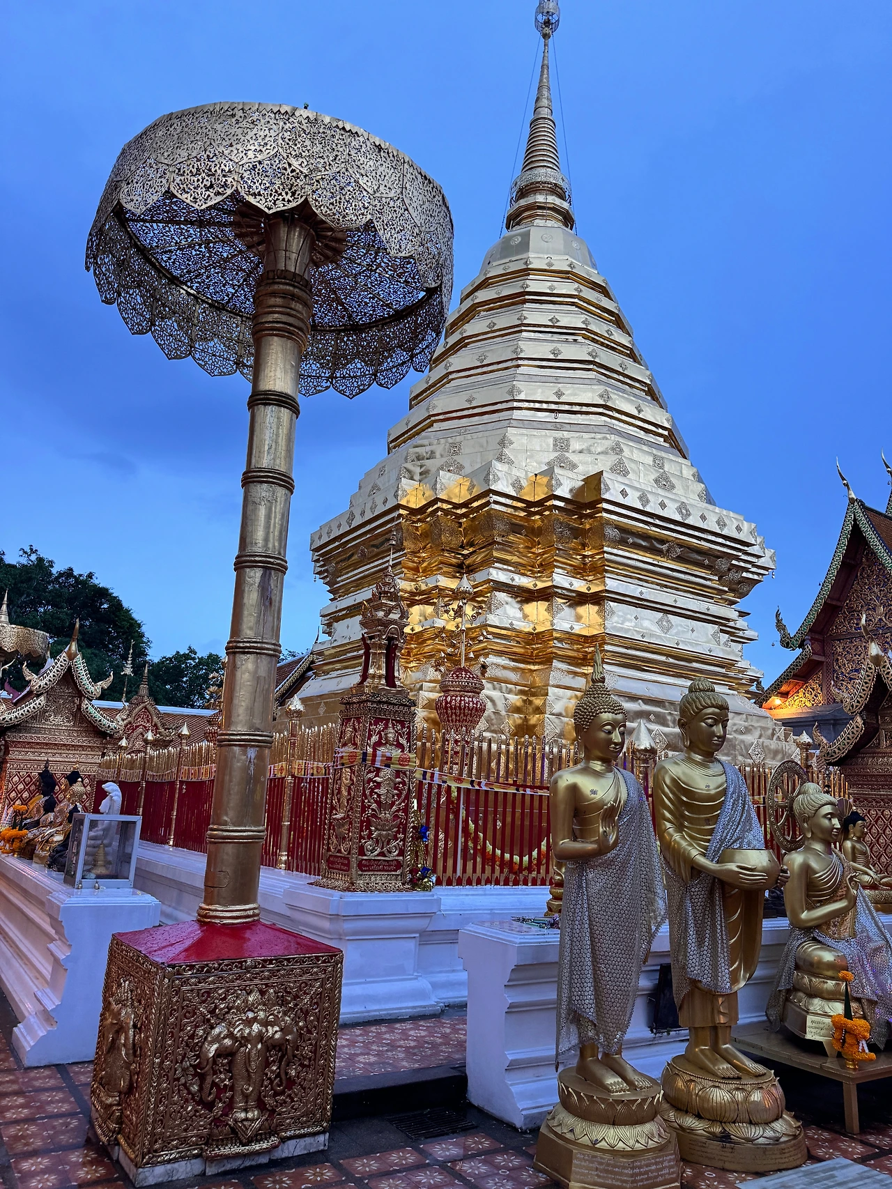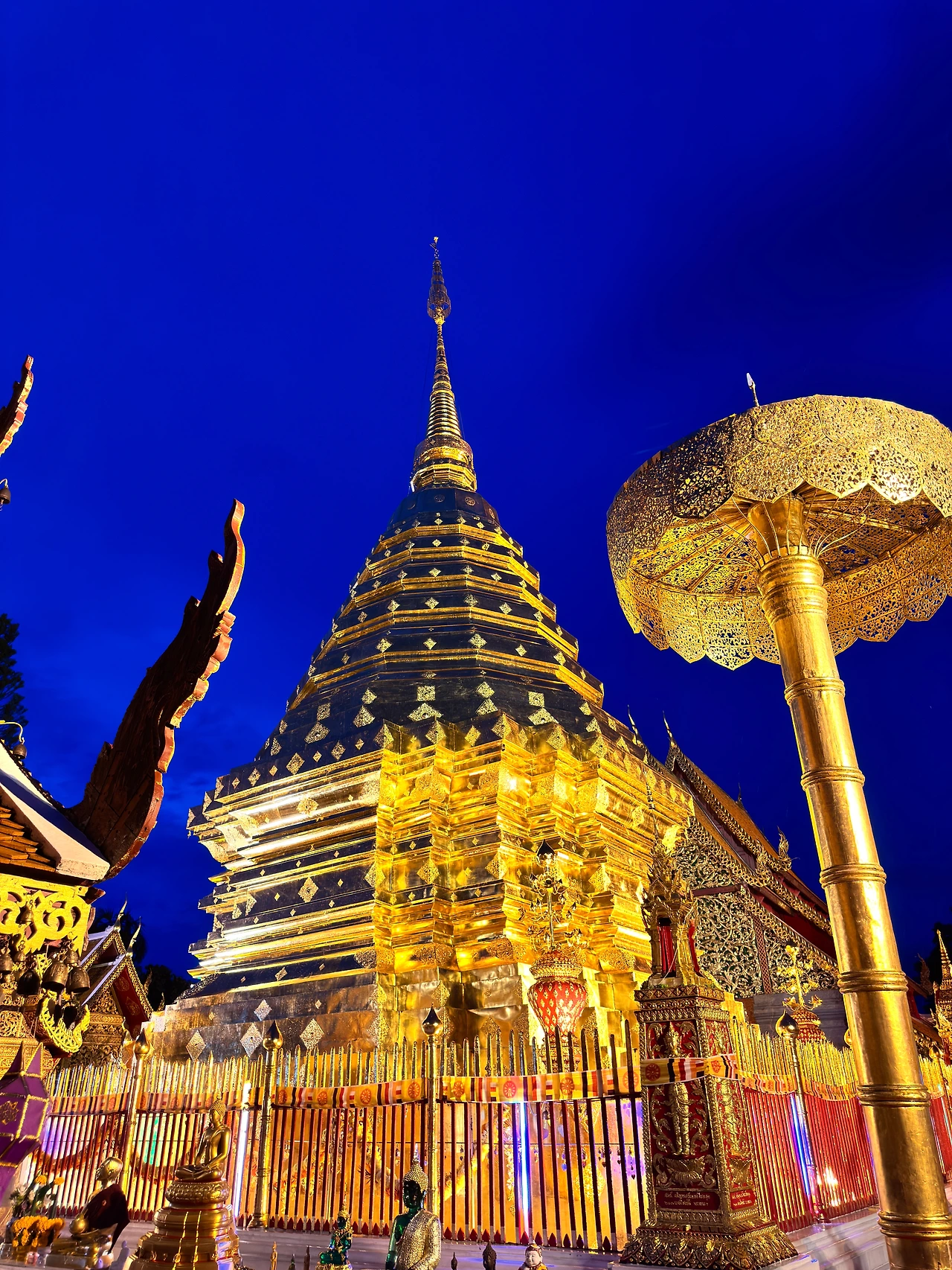 해가 서쪽으로 기울고 어둠이 찾아오면서 도이 스텝은 완전히 다른 얼굴을 드러낸다. 조명이 하나둘 켜지기 시작하자 주간의 화려함이 야간의 환상으로 변모한다. 황금빛 체디가 깊고 짙은 코발트블루 하늘을 배경으로 찬란하게 빛나는 순간, 숨이 멎을 듯한 아름다움에 압도된다. 14세기 란나 왕국 시대부터 부처의 사리를 모셔온 거대한 체디 주변으로 배치된 황금 불상들이 조명을 받아 마치 살아서 움직이는 듯하다. 연꽃 자세로 앉아 명상에 잠긴 불상들의 자비로운 미소가 황금빛 후광 속에서 더욱 신성하게 빛난다. 정교한 우산 장식들이 조명을 받아 레이스처럼 섬세한 그림자를 만들어내고, 사원 곳곳의 장식들이 금박을 입은 듯 눈부시게 반짝인다. 이 순간, 란나 왕국 700년 역사의 모든 기예와 신앙이 하나의 완벽한 예술작품으로 완성되어 있음을 깨닫는다.