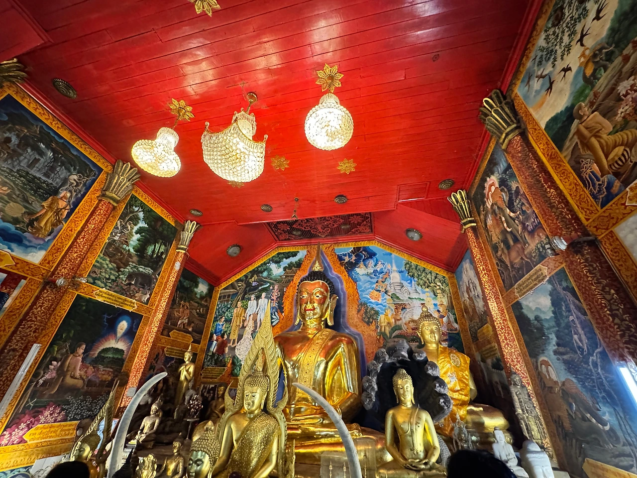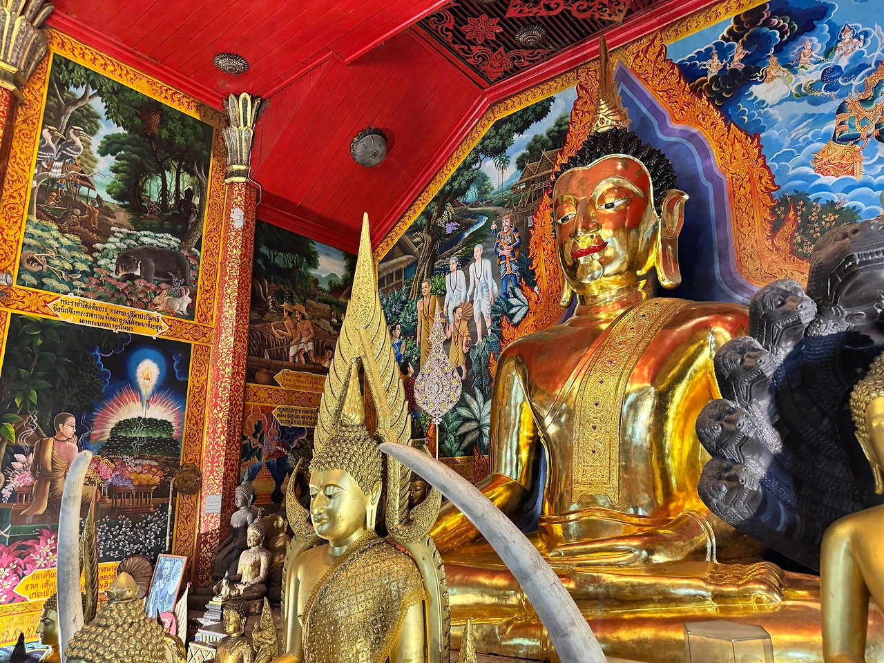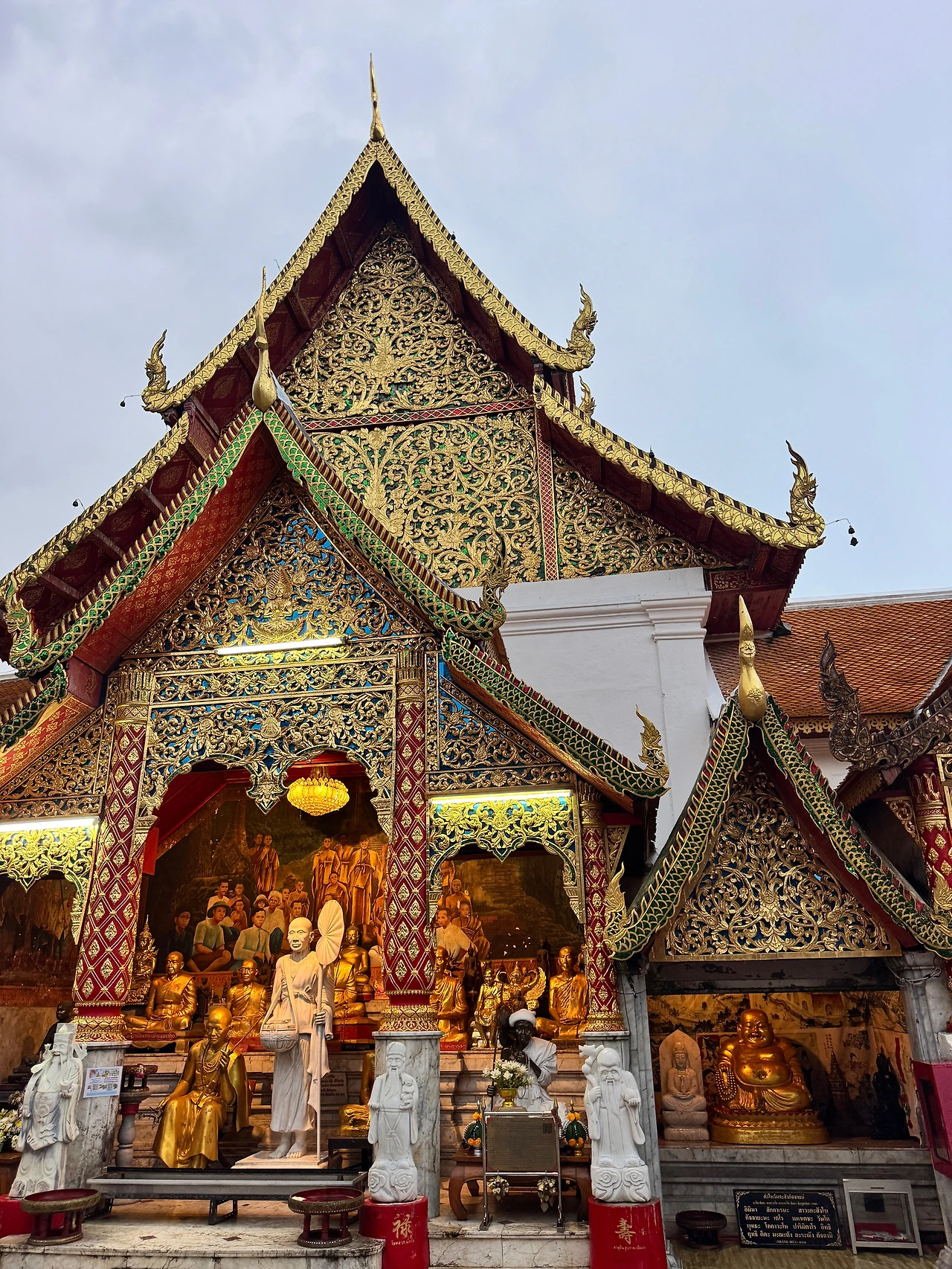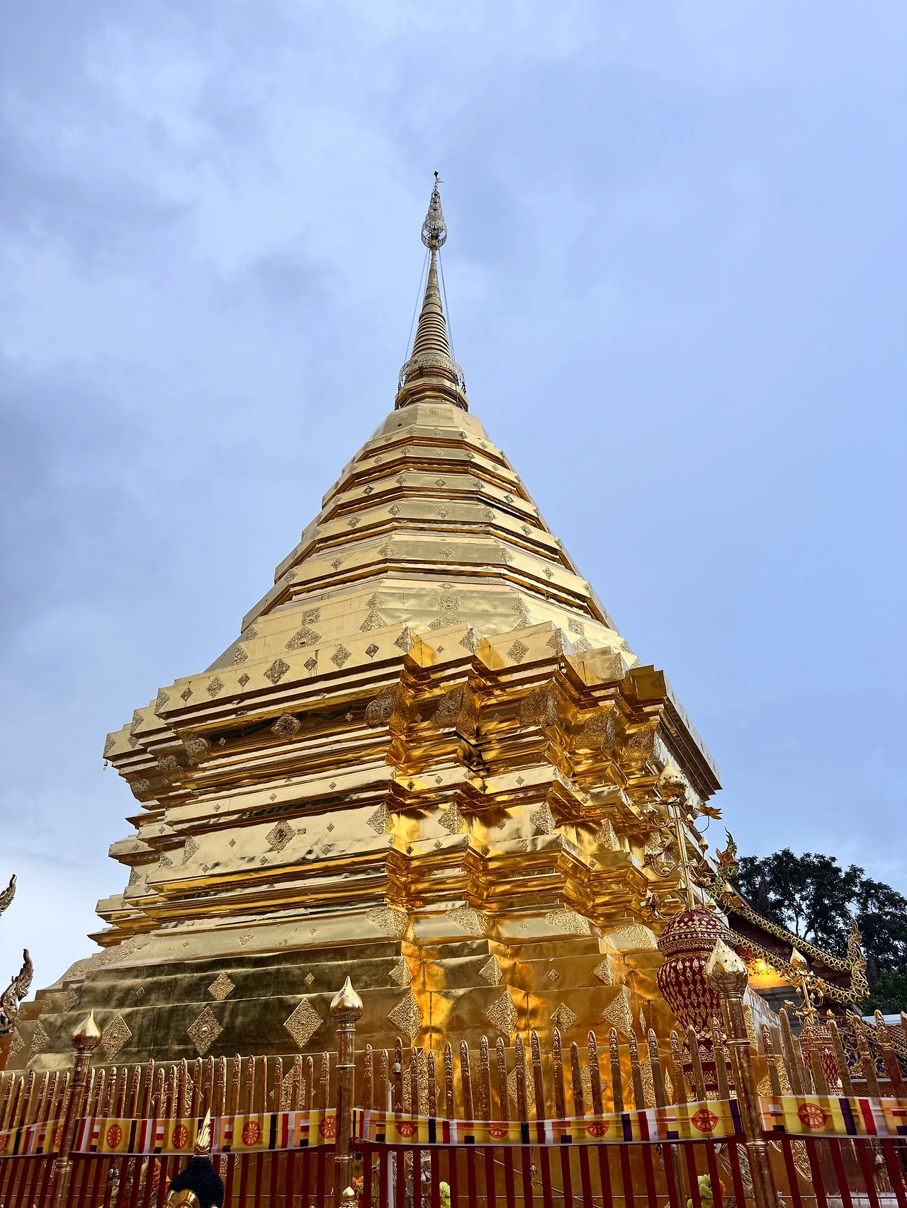 해가 서쪽으로 기울고 어둠이 찾아오면서 도이 스텝은 완전히 다른 얼굴을 드러낸다. 조명이 하나둘 켜지기 시작하자 주간의 화려함이 야간의 환상으로 변모한다. 황금빛 체디가 깊고 짙은 코발트블루 하늘을 배경으로 찬란하게 빛나는 순간, 숨이 멎을 듯한 아름다움에 압도된다. 14세기 란나 왕국 시대부터 부처의 사리를 모셔온 거대한 체디 주변으로 배치된 황금 불상들이 조명을 받아 마치 살아서 움직이는 듯하다. 연꽃 자세로 앉아 명상에 잠긴 불상들의 자비로운 미소가 황금빛 후광 속에서 더욱 신성하게 빛난다. 정교한 우산 장식들이 조명을 받아 레이스처럼 섬세한 그림자를 만들어내고, 사원 곳곳의 장식들이 금박을 입은 듯 눈부시게 반짝인다. 이 순간, 란나 왕국 700년 역사의 모든 기예와 신앙이 하나의 완벽한 예술작품으로 완성되어 있음을 깨닫는다.