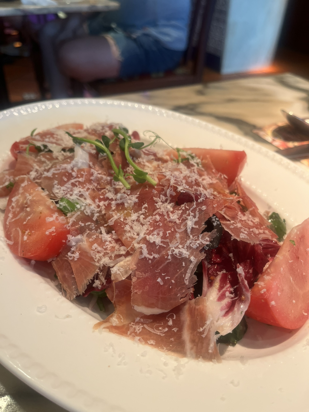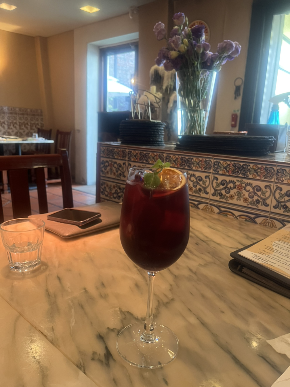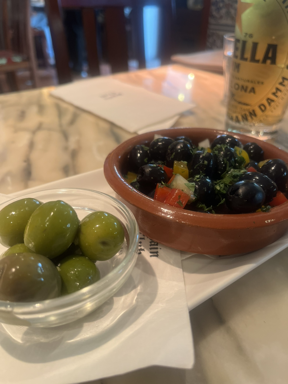 샹그리아 두 잔, 감바스, 올리브, 바게트, 하몽 샐러드.
