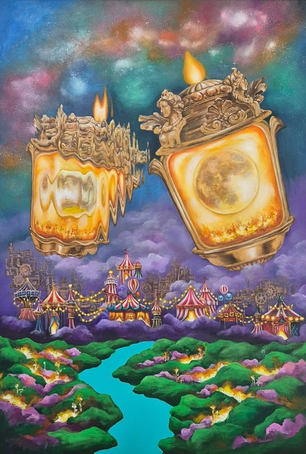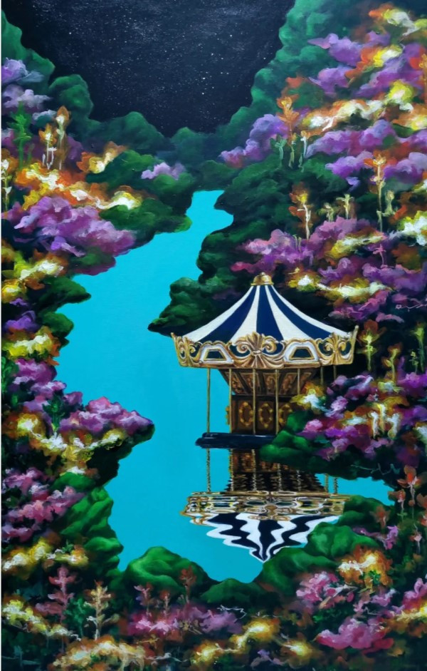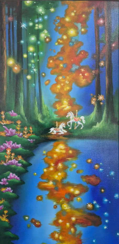 전시장에 들어서면, 첫인상은 “숲”이지만 동시에 “물 위”다. 작가가 그린 나무와 풀잎이 물결 위로 그 모습이 전이되는 순간, 관객인 저는 얼마간 멈춰 서서 그 잔상에 숨을 고른다. 이 ‘반영된 자아(reflected self)’라는 주제는 작품 곳곳에서 물빛처럼 띠지를 두르고 있다. 물 위 회전목마, 유니콘, 별빛들—어린 시절의 환상을 부드럽게 불러내는 상징들이 현실의 시간에 다시 깃든다.