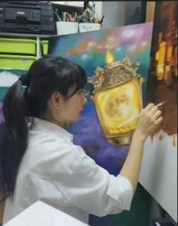 그림 앞에서 느꼈던 감정들이 이 한 장의 사진으로 정리되었다. 그림 속 몽환과 동화가 사실은 이토록 현실적이고 열정적인 붓질에서 태어난다는 것을. 하얀 셔츠를 입은 작가는 깊은 몰입 속에서 노란빛 등을 섬세하게 표현하고 있었다. 그림이 아닌, 살아 있는 장면 같았다.