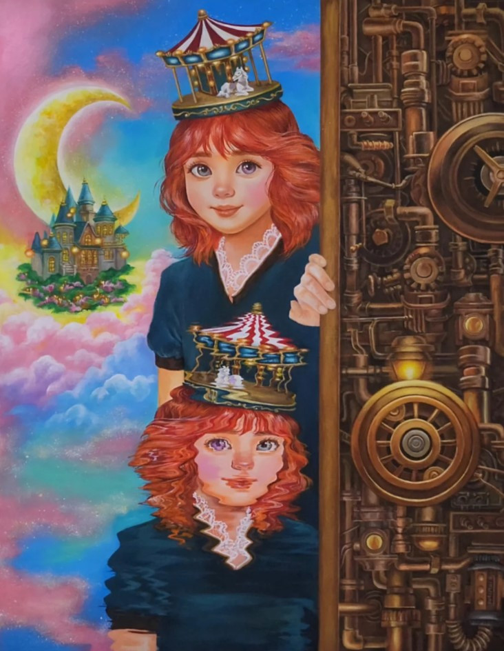 이 그림 앞에서 오랜 시간을 멈추어 서 있었다. 밝은 동화의 세계와 어두운 기계적 구조물 사이에 선 한 사람. 현실과 환상, 그리고 이상과 시스템. 그 사이에서 우리는 매일 선택한다.