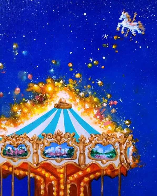 반짝이는 꽃잎, 바람결, 금빛 회전목마의 왕관. 현실과 상상의 경계가 무너지는 순간이었다.