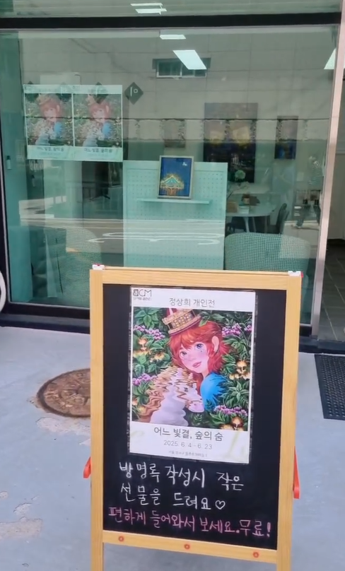 갤러리 앞에는 작은 칠판이 있었다. “편하게 들어오세요. 무료!”라는 문구와 함께, 방문록을 쓰면 작은 선물을 준다는 안내가 있었다.
