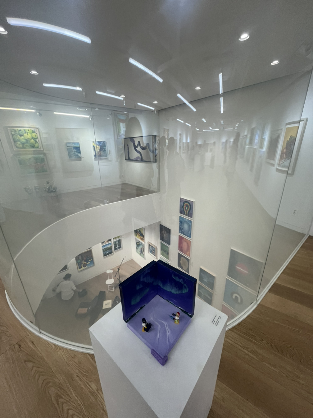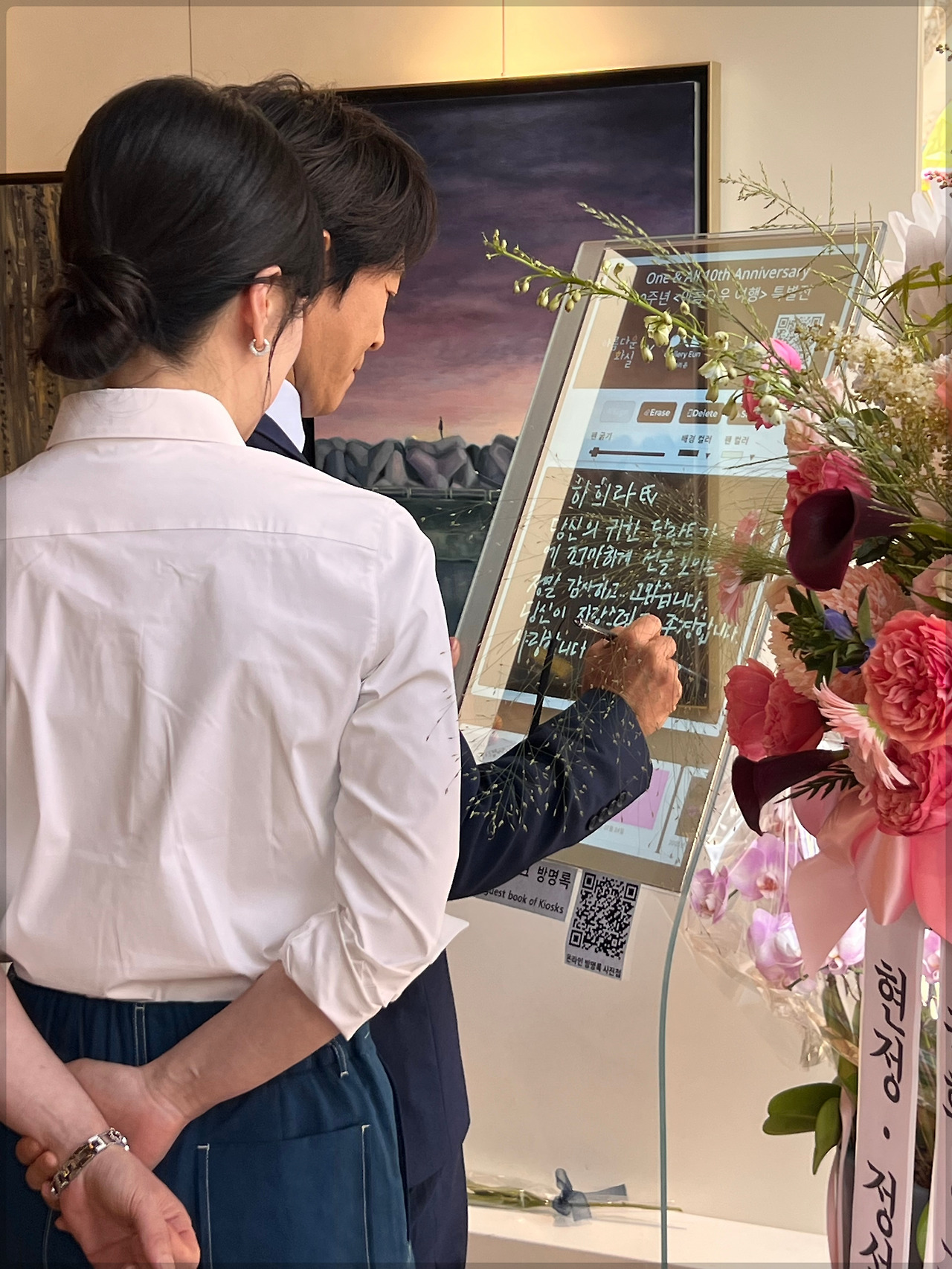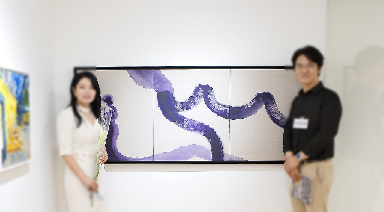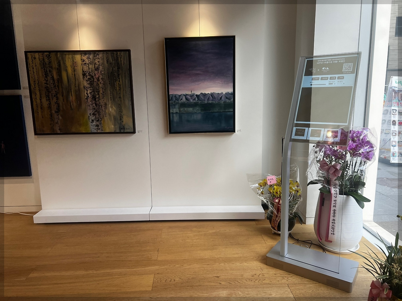 이번 전시의 주제는 “모두 함께 다 같이(One & All)”야. 이 문장이 전시장을 관통하는 방식은 명확해. 참여 작가 누구도 지나치게 앞에 나서지 않고, 작품 하나하나가 자신만의 리듬으로 공간에 머물고 있어. 나의 소중한 작품 한점이 갤러리의 창가에서 살짝 보이는 위치, 키오스크 방명록 뒤에 있는데 그 자리가 마음에 들어. 그냥 지나치는 공간이기도 하지만, 그 자리를 잘 지키고 있는 느낌이 들어. 보랏빛이 그 장소에 딱 어울리기도 해.