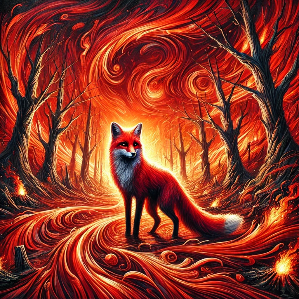 미오와 하루가 마음의 화실로 돌아와 새로운 그림을 발견했습니다. 이번에는 강렬한 붉은빛이 가득한 그림이었어요. 캔버스 속에는 날카로운 눈빛을 가진 붉은 여우가 황폐한 숲 한가운데 서 있었습니다. 여우의 주위에는 불꽃 같은 붉은빛이 소용돌이치고 있었고, 그 숲은 불에 타고 있는 듯 보였죠.