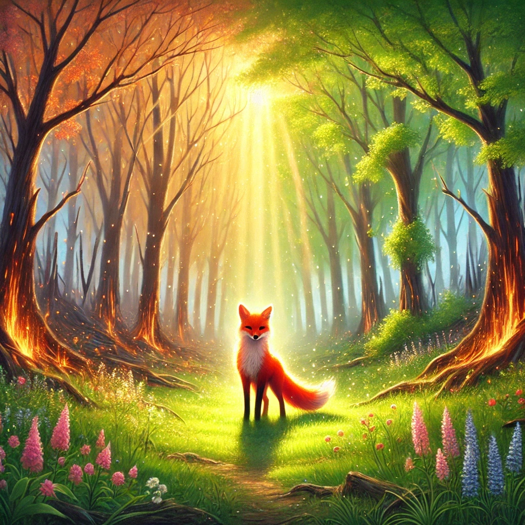 눈을 떠보니, 그들은 타오르는 숲 속 한가운데 서 있었습니다. 앞에는 붉은빛으로 빛나는 여우가 서 있었고, 여우의 눈빛은 날카롭고 깊은 슬픔이 담겨 있었습니다.