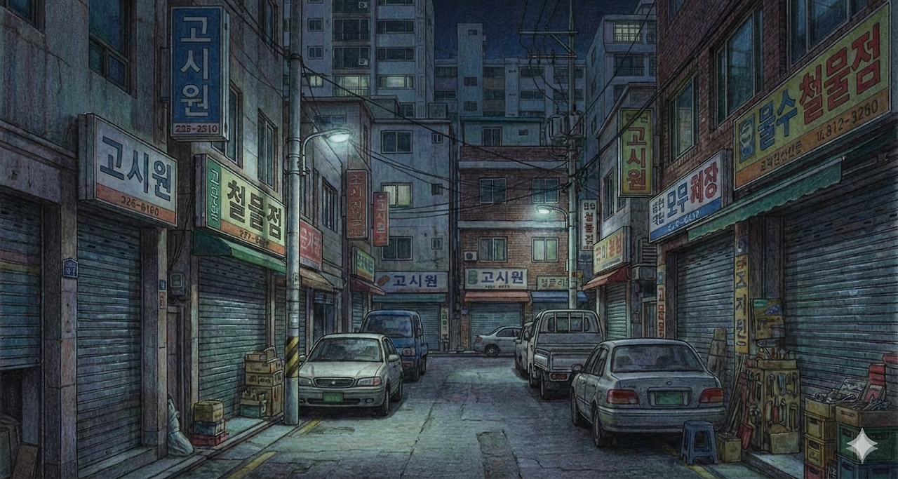 건물 밖으로 나오자 차가운 밤공기가 폐부 깊숙이 박힌다. 관사로 향하는 길목에는 낮의 활기가 거세된 오래된 공구골목이 어둠을 껴입은 채 가라앉아 있다.