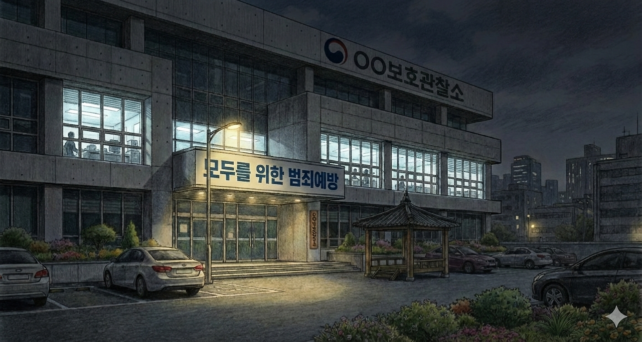 인근 건물들의 불빛들이 퇴근과 함께 하나둘 꺼져갈 때, 보호관찰소의 창문은 여전히 창백한 불빛을 토해낸다.