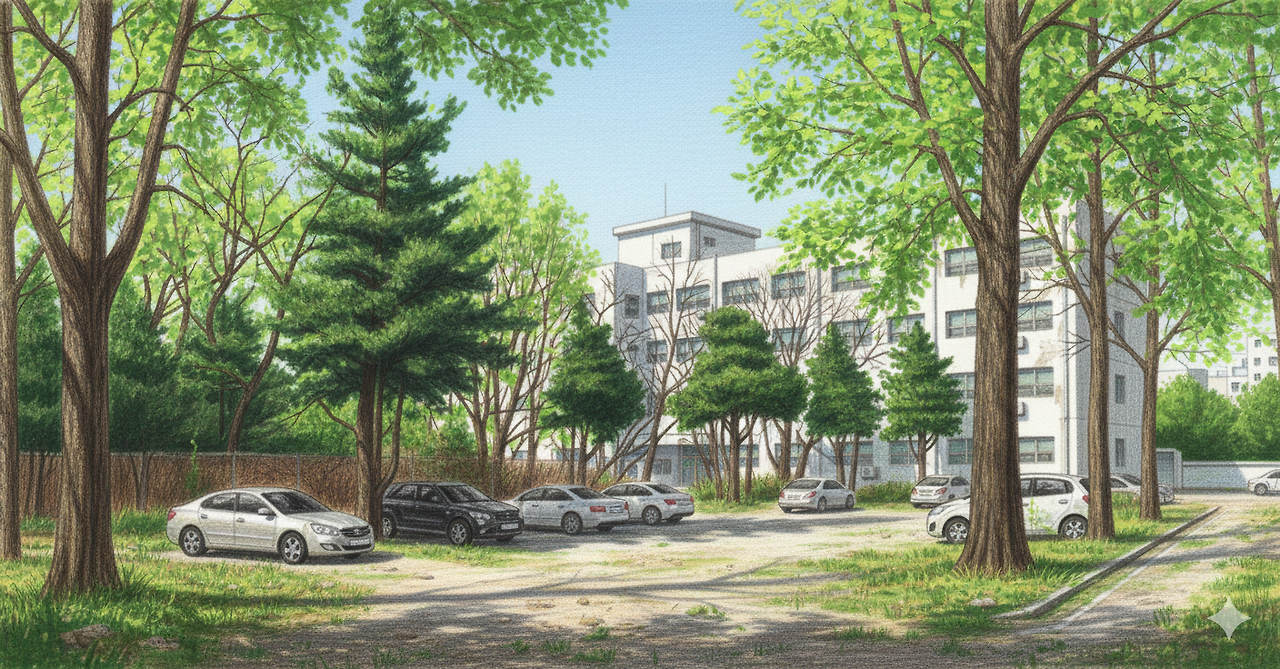 건물 뒤편, 포장되지 않은 흙마당으로 차를 몰았다. 키 큰 나무들이 쏟아내는 짙은 그늘은 대낮임에도 서늘한 습기를 머금고 있다. 나무 밑동 근처에 시동을 끄자, 비로소 이곳의 무게감이 전해진다.
