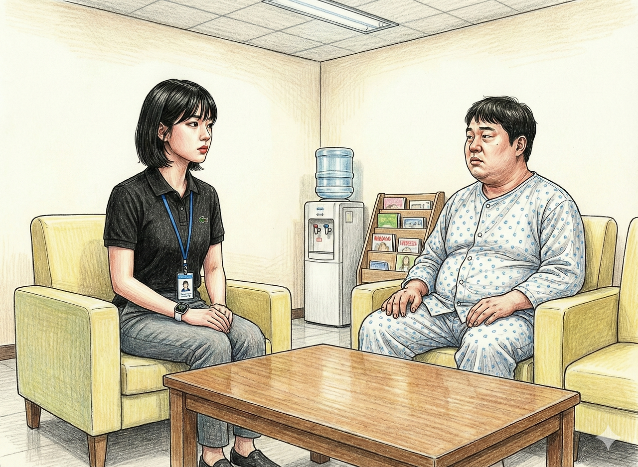 그는 여자친구를 향한 통제되지 않는 집착 끝에 건물에서 뛰어내리려 소동을 피웠고, 그 소동의 끝이 바로 이곳, 행정입원이었다. 자살 충동이 있는 대상자들에게 법이 줄 수 있는 가장 안전하고도 잔인한 보호 장치.