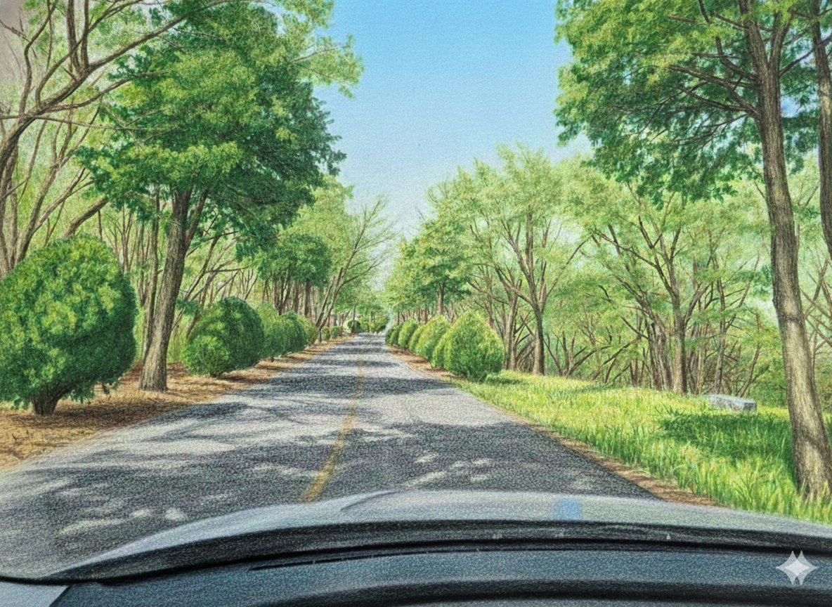 차 문을 열자 흙냄새와 함께 정체된 공기가 훅 끼쳐온다. 한여름의 열기조차 산그늘의 고요 앞에서는 제 기세를 잃고 흩어진다.