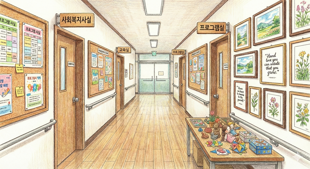 천장의 등은 하얀 빛을 쏟아내고, 그 빛 아래 양옆 벽면에는 환자들이 직접 만든 작품들이 빼곡하게 걸려 있다. 강렬한 색채의 유화부터 섬세한 종이 공예까지.