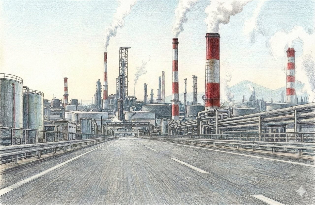 산 중턱 병원을 뒤로하고 내리막길을 따라 천천히 산을 내려온다. 굽이진 길을 빠져나와 다시 운전대를 잡은 지 40여 분. 창밖은 은빛 파이프와 거대한 탱크들이 미로처럼 엉킨 공장 지대로 바뀐다.