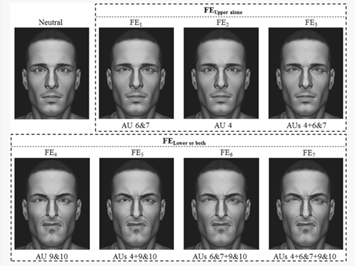 이 중 FE1~3, 그림 윗 줄 두 번째부터 네 번째에 해당하는 표정은 주로 눈 주위, 미간과 같이 얼굴의 상단 움직임의 조합만으로 표현한 고통 표정이다. FE4~7의 경우 얼굴의 하단 움직임만 이용하거나 또는 하단 움직임을 포함한 조합으로 표현되는 고통 표정이다. 연구자들은 이렇게 제작한 7가지 고통 표정에서 FE6을 제외한 표정의 정서 강도를 조작하여 참가자에게 제시하였다. 제시되는 고통 표정은 일정한 정서 강도까지 점차 변화하였다. 중립적인 표정을 0%, 최종 표정을 100%라고 할 때, 연구자들은 각 표정 별로 중립 표정에서 시작하여 세 수준의 정서 강도(50%, 70%, 90%)에 도달할 때까지 변화하는 얼굴을 제작하였다.