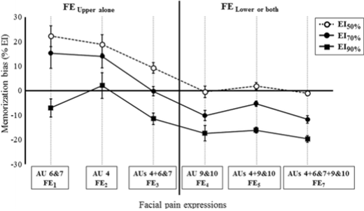 최근, 한 연구는 이처럼 기억 편향의 방향성이 서로 다르게 발생하는 현상이 표정이 발생하는 얼굴의 영역과 관련 있을 수 있다고 주장하였다(Prigent et al., 2018). 연구진은 아래와 같이 고통을 표현하는 7가지 형태의 3D 얼굴 모형을 제작하였다. 이 7가지의 공포 표정은 얼굴의 영역을 조작하여 생성하였다.
