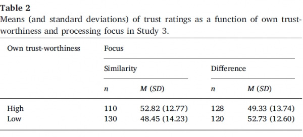 그 결과, 자기 신뢰가 높은 집단에서는 상대방이 자신과 유사하다고 지각했을 경우 타인에 대한 신뢰가 높게 나타났고, 자기 신뢰가 낮은 집단에서는 상대방이 자신과 다르다고 느낄 경우 타인에 대한 신뢰가 높게 나타났습니다. 이는 사람들이 상대방에 대한 신뢰도를 평가할 때, 본인의 행동을 기준 삼아 자기 자신과 비슷하게 행동할 것이라는 생각 하며, 자신과 유사성을 보일 때 이런 자기중심적 사고의 경향성이 더 높아진다는 것을 의미합니다.
