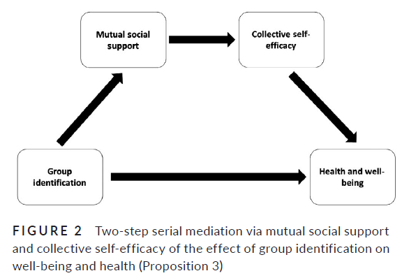 2) 집단 동일시(group identification). 이는 집단 정체성과 건강, 웰빙을 연결하는 주요 메커니즘으로 상호 사회적 지원과 집단적 자기 효능성 증대를 가져옵니다. 이러한 조절 메커니즘은 집단 구성원들의 개별적인 행동이 상호적 목표에 도달하도록 조정된다는 생각에 기초합니다. 이런 의미에서 집단 구성원은 집단 구성원들이 더 많이 동일시할수록 서로를 더 지지하는 경향성이 강해집니다.