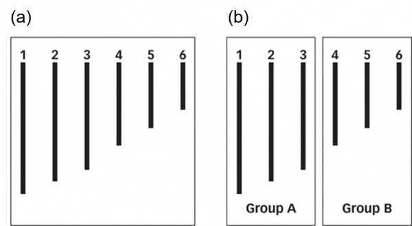 이렇듯 논쟁이 있긴 하지만, 제공되는 특정 타이틀이 가장 기본적인 시각 속성의 지각에 영향을 미치는 것은 확실하다. 아래의 그림을 보자. 왼쪽이던 오른쪽이던 6개의 선분이 있다. 주목할 것은 3번과 4번 선분의 길이이다. (a)와 (b)그림의 3번, 4번 선분의 차이가 어떻게 보이는가? 사실 그림에서 사용된 1번에서 6번 선분은 (a)이던 (b)이던 동일하다. 하지만, (a)에서처럼 하나의 네모 안에 6개의 선분이 있을 때는 1번 선분에서 6번 선분으로 갈수록 점진적으로 길어지는 것처럼 보이는 반면, (b)에서처럼 두 개의 네모로 구분해 놓으면 3번 선분과 4번 선분의 차이가 크게 느껴질 것이다. 이는 동일한 집단에 속한 자극들의 차이는 과소평가하고 다른 집단에 속한 자극들의 차이는 과대평가하기 때문인데, 3번 선분과 4번 선분이 한 집단에 속하여, 동일 집단이라는 타이틀을 얻으면 그 차이가 적게 보이지만, 두 집단에 각기 속하게 되어 다른 집단이라는 타이틀을 얻으면 그 차이가 더 크게 보이게 되는 것이다.