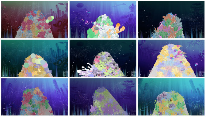 그러나 인터뷰 동안 수집된 신체 신호로 만들어지는 영상 속 생생한 컬러의 바다 생물들은 화면의 이쪽에서 저쪽으로 자유롭게 춤춘다. 위로 떠오르고 가라앉고 확장하고 축소하며 혼자 떠다녔다가 무리 지었다가 머물렀다가 떠났다. 아마도 화자의 현실에서는 그런 일이 별로 일어나지 않았을 것이다.