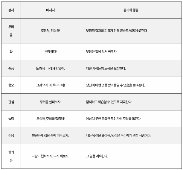 그는 인간과 동물의 다양한 정서 표현과 관련된 연구에서 "정서는 근본적으로 적응적이고 환경의 요구에 적합한 방법으로 행동을 조직하는데 도움이 된다."는 결론을 내린다. 즉, 우리가 어떤 정서를 경험하게 되면 그 정서가 보내는 메시지에 따라 환경에 효과적으로 대처할 수 있는 행동을 할 수 있다는 것이다. 다음은 주요 정서의 메시지와 이에 따라 동기화되는 행동들의 목록이다.