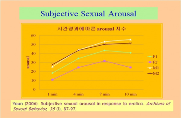 필자는 남녀 간의 선천성과 후천성에 의한 성적 차이를 가늠하기 위해 다음과 같은 실험을 실시한 바 있다. 남녀 대학생들을 포르노 동영상에 노출시킨 후, 이들에게 성적으로 흥분된 수준을 주관적으로 평가토록 하는 실험을 실시한 바 있다. 실험 참가자가 동영상을 보기 시작한 지 1분, 4분, 7분, 10분이 될 때마다 그 순간의 흥분 상태를 0에서 100 사이의 수치로 표현하면 되는 것이었다.