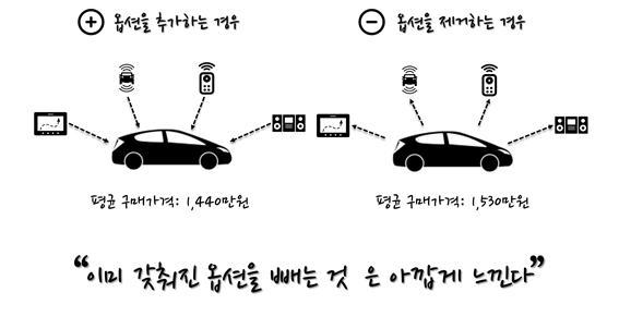 그렇다면 이러한 보유효과를 어떻게 활용할 수 있을까? Park과 동료들은 흥미로운 실험을 하였다(Park et al., 2000). 자동차를 구매할 때 제시하는 옵션에 따른 선택의 차이를 확인한 것이다. 구체적으로, 옵션 제시 방식은 1) 아무것도 없는 기본 모델에서 옵션을 하나씩 추가하는 방식과 2) 풀-옵션 상태에서 불필요한 것을 하나씩 제외시키는 방식으로 구분된다. 두 방식 중에 어떤 것이 결과적으로 더 많은 옵션을 선택하게 했을까?