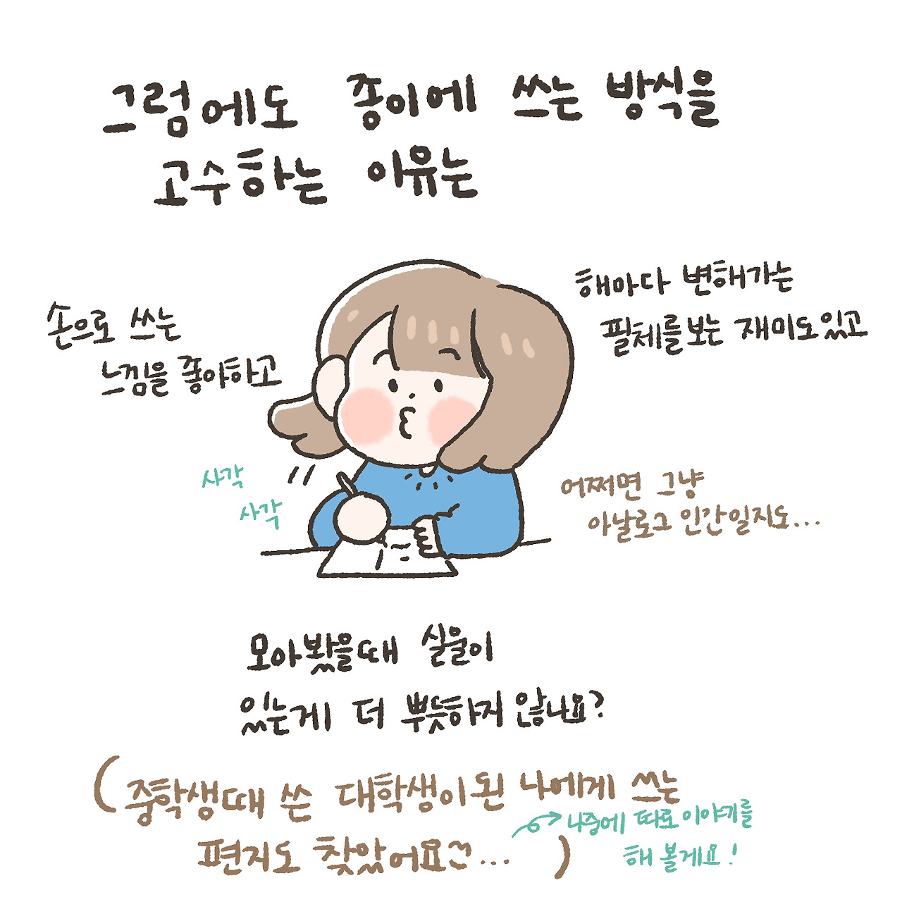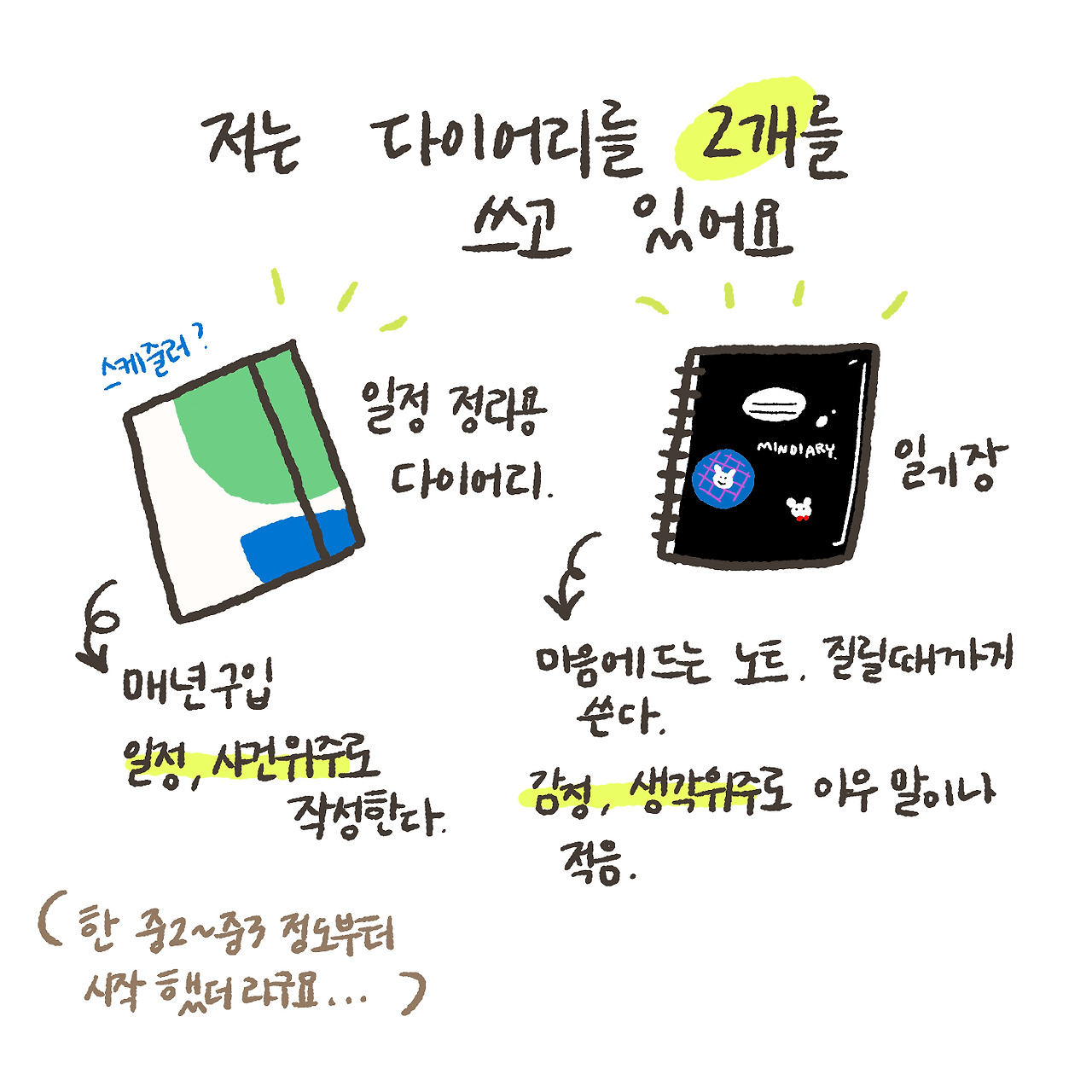 저는 인스타@mind1ary 계정에서 간단한 그림과 일상에서 느낀 일, 있었던 일들을 그려서 올리는 민지라고 합니다. 멋진 필명을 갖고 싶은데, 아직 멋진 필명을 정하지 못해서 본명으로 저를 소개하게 되었네요.